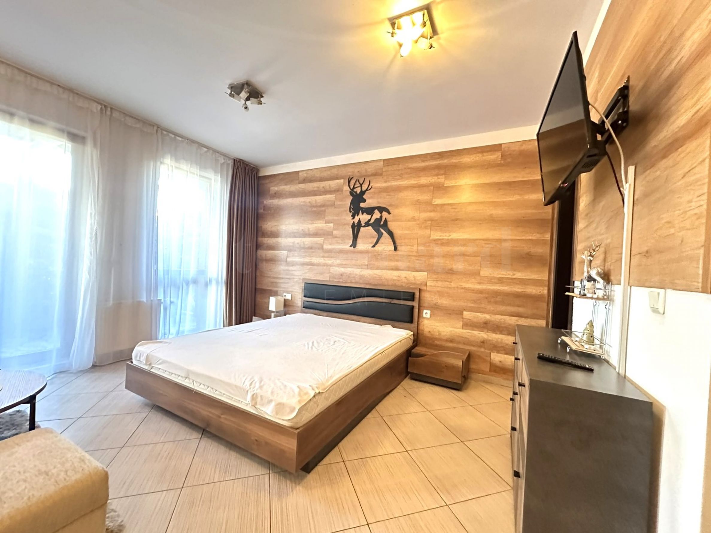 Част от стените са декорирани с тапети с дървесен ефект, които създават усещане за топлина и уют.