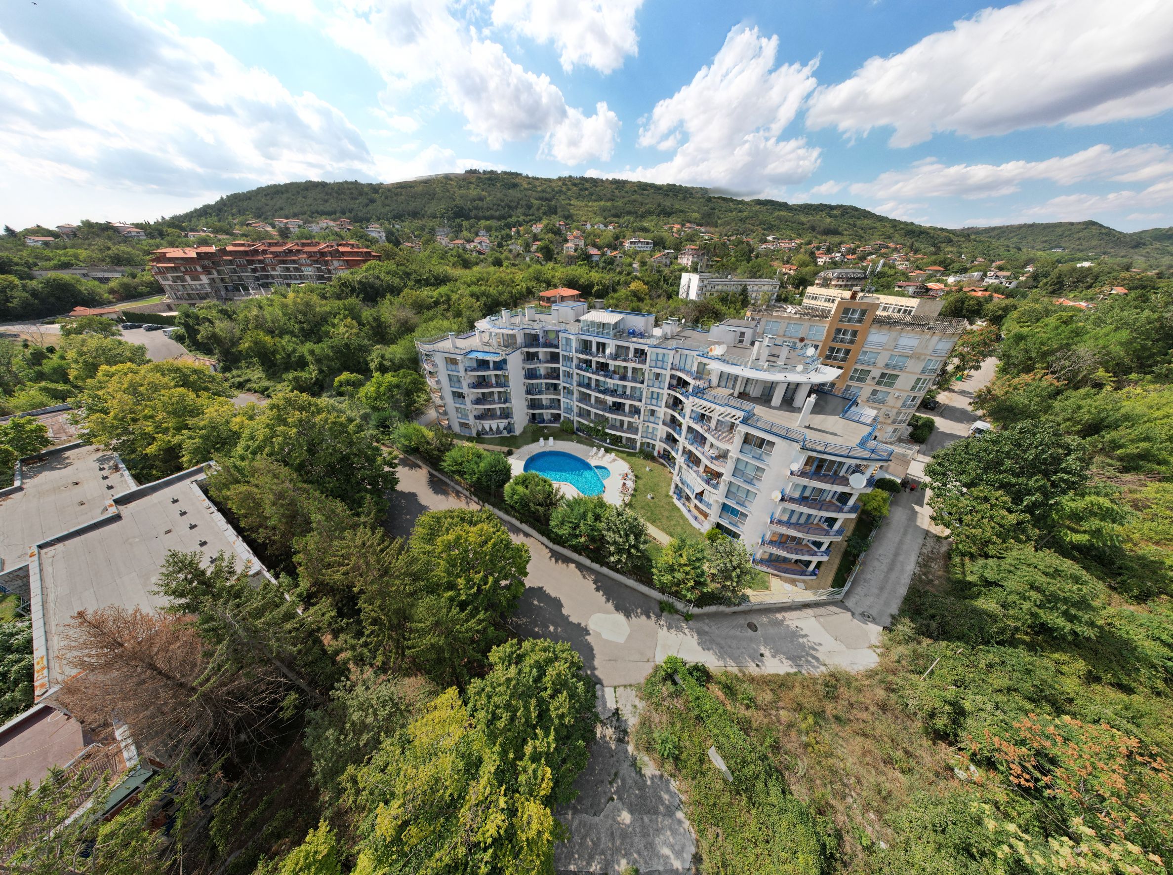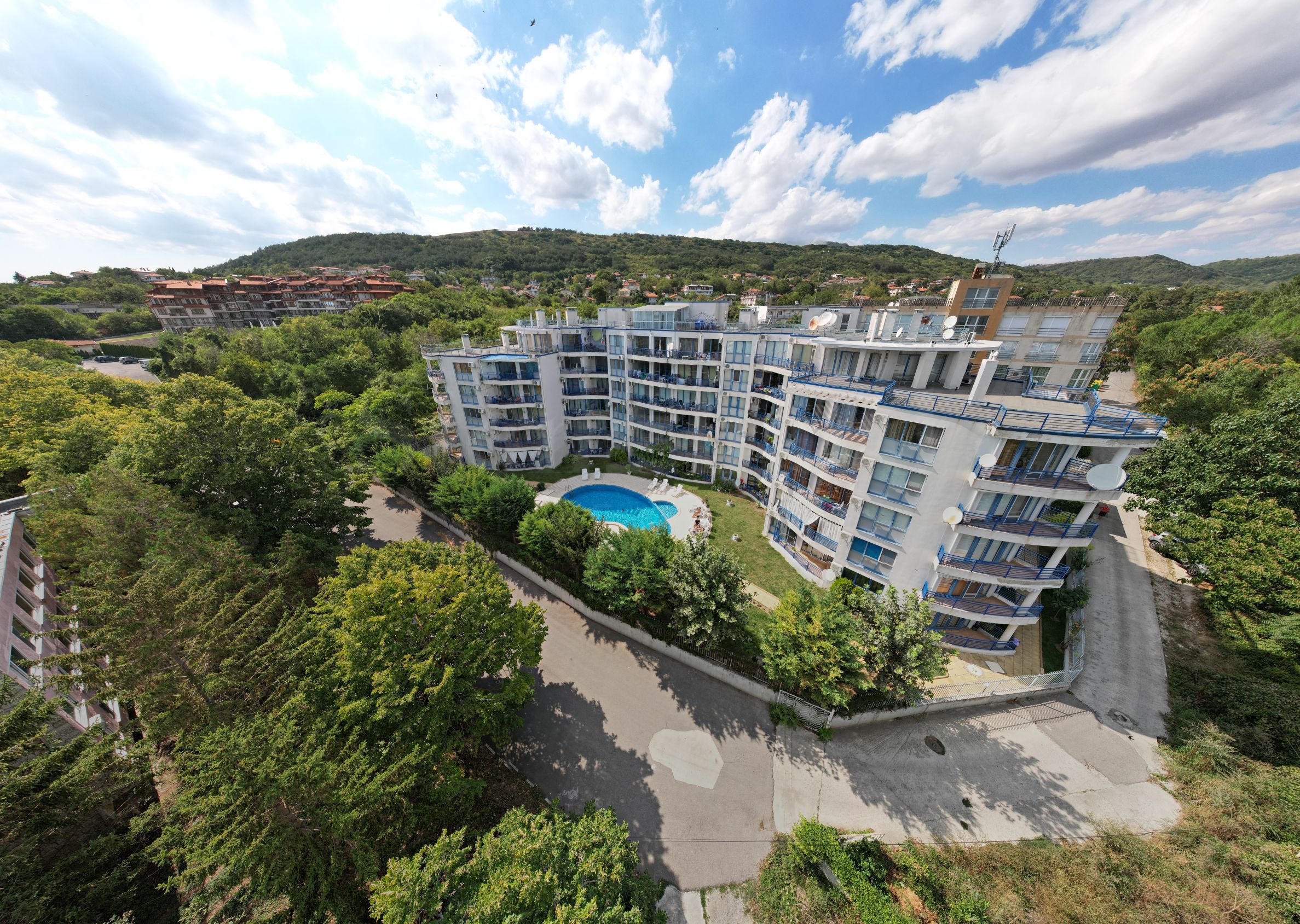 Комплексът, в който е разположен предлаганият имот, се състои от две огледални сгради, построени върху парцел от 2950 кв.м. Общият брой на апартаментите е 84, а допълнителните удобства включват открит басейн, фитнес център и бар.