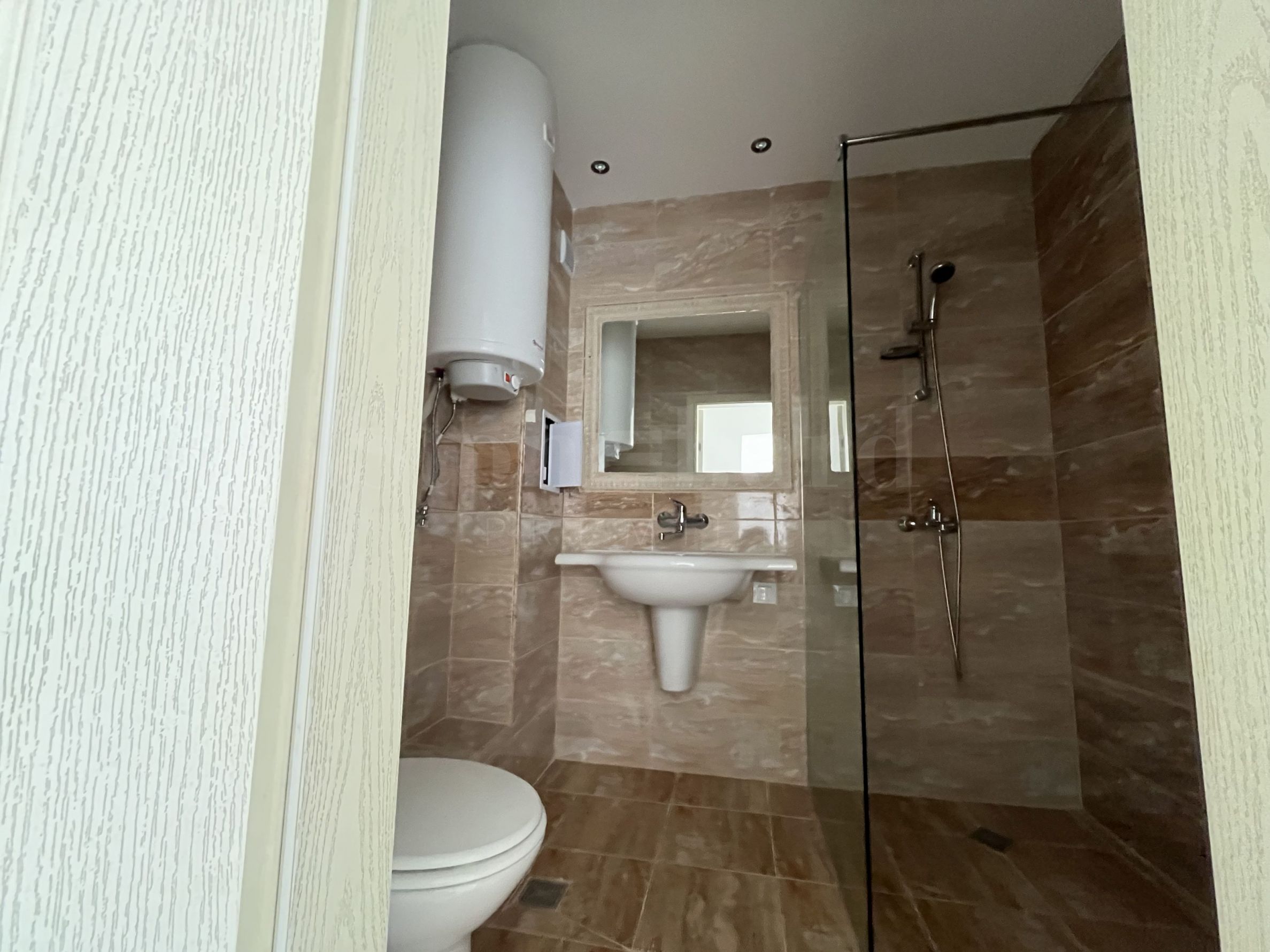 Баня – под – теракот, стени – фаянс, душ батерия, моноблок, мивка, душ кабина и бойлер.