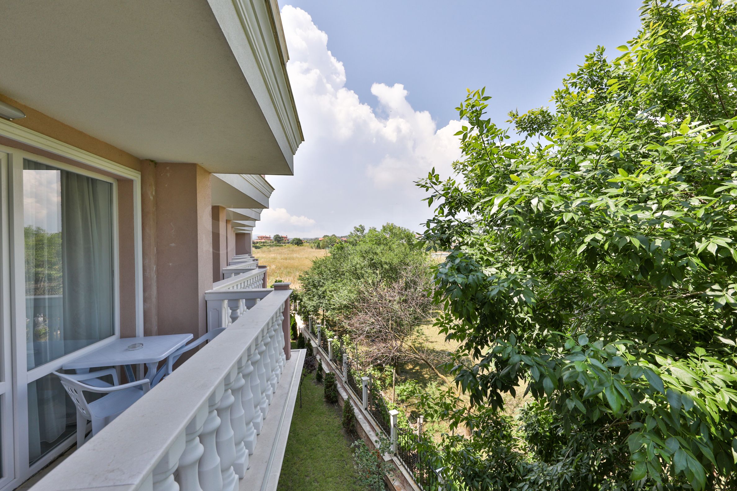 Апартаментът има просторна тераса с красива гледка към зеленината на курорта и морето.