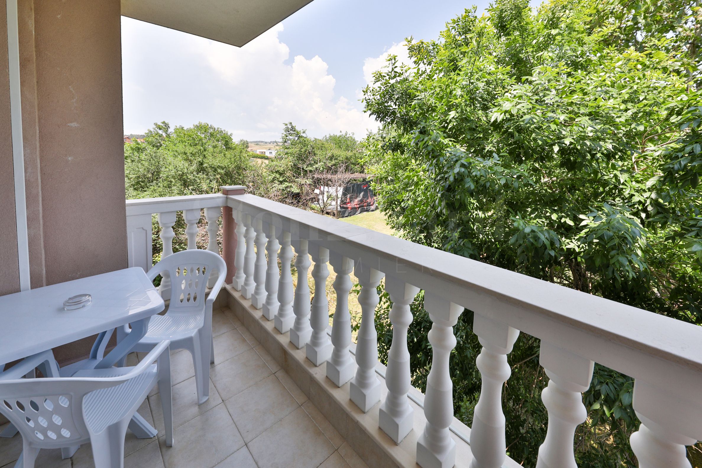 Апартаментът има просторна тераса с красива гледка към зеленината на курорта.