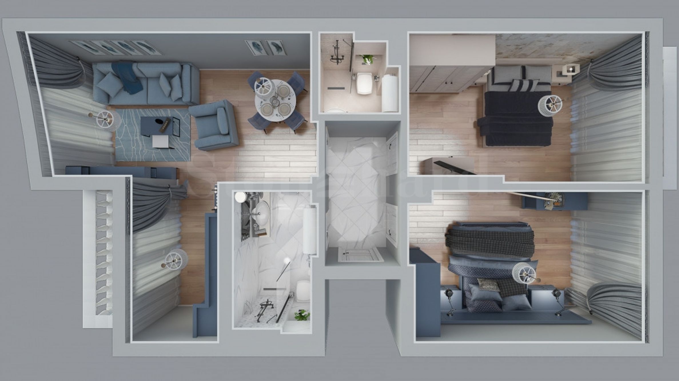 Имотите се издават в степен на завършеност "до ключ", готови за обзавеждане, с оборудвани бани, като има опции за няколко варианта бутиково обзавеждане по дизайн проекта, примерните визуализации и реални снимки на обзаведени апартаменти, можете да разгледате в снимковия материал към тази оферта.