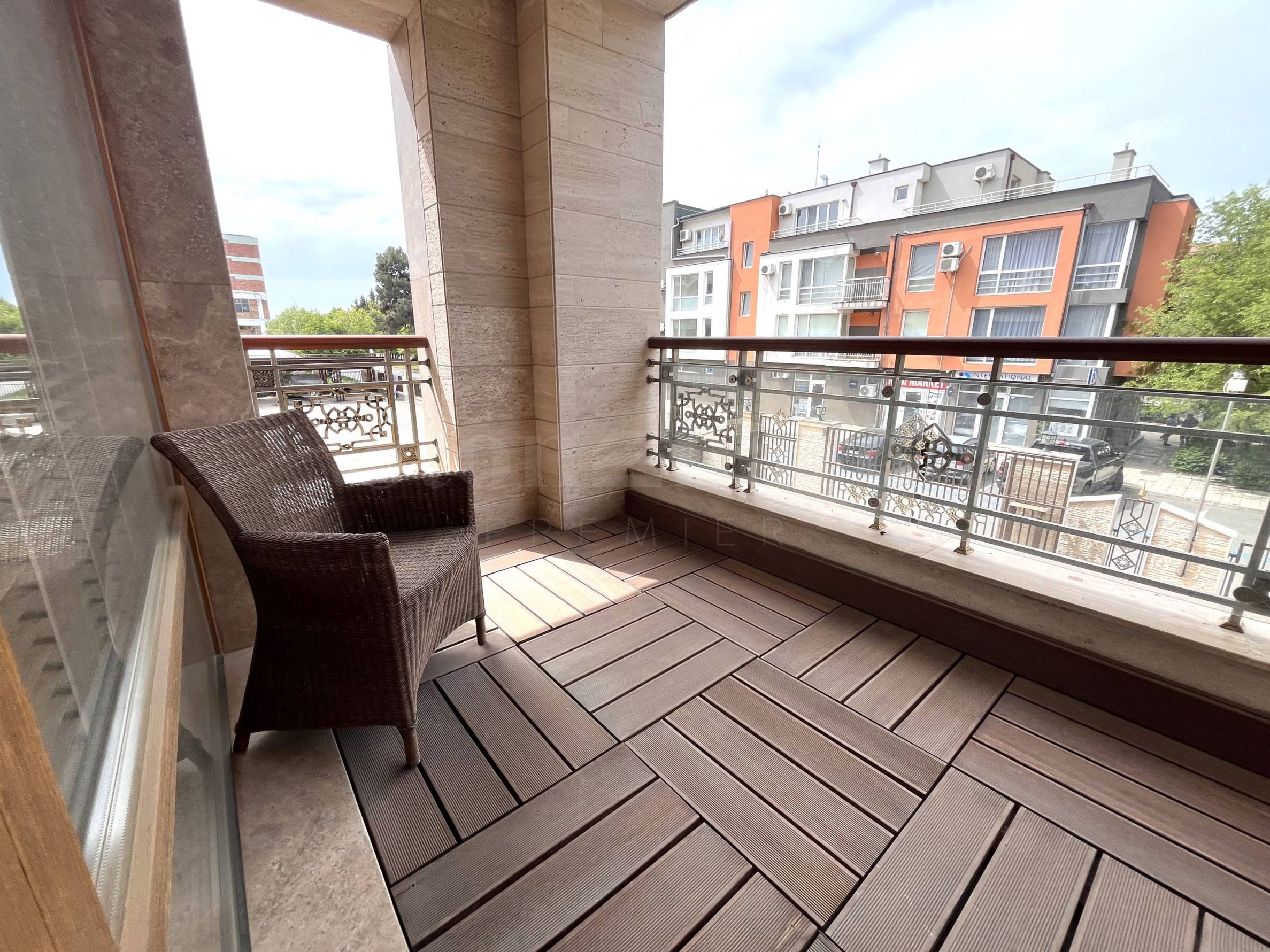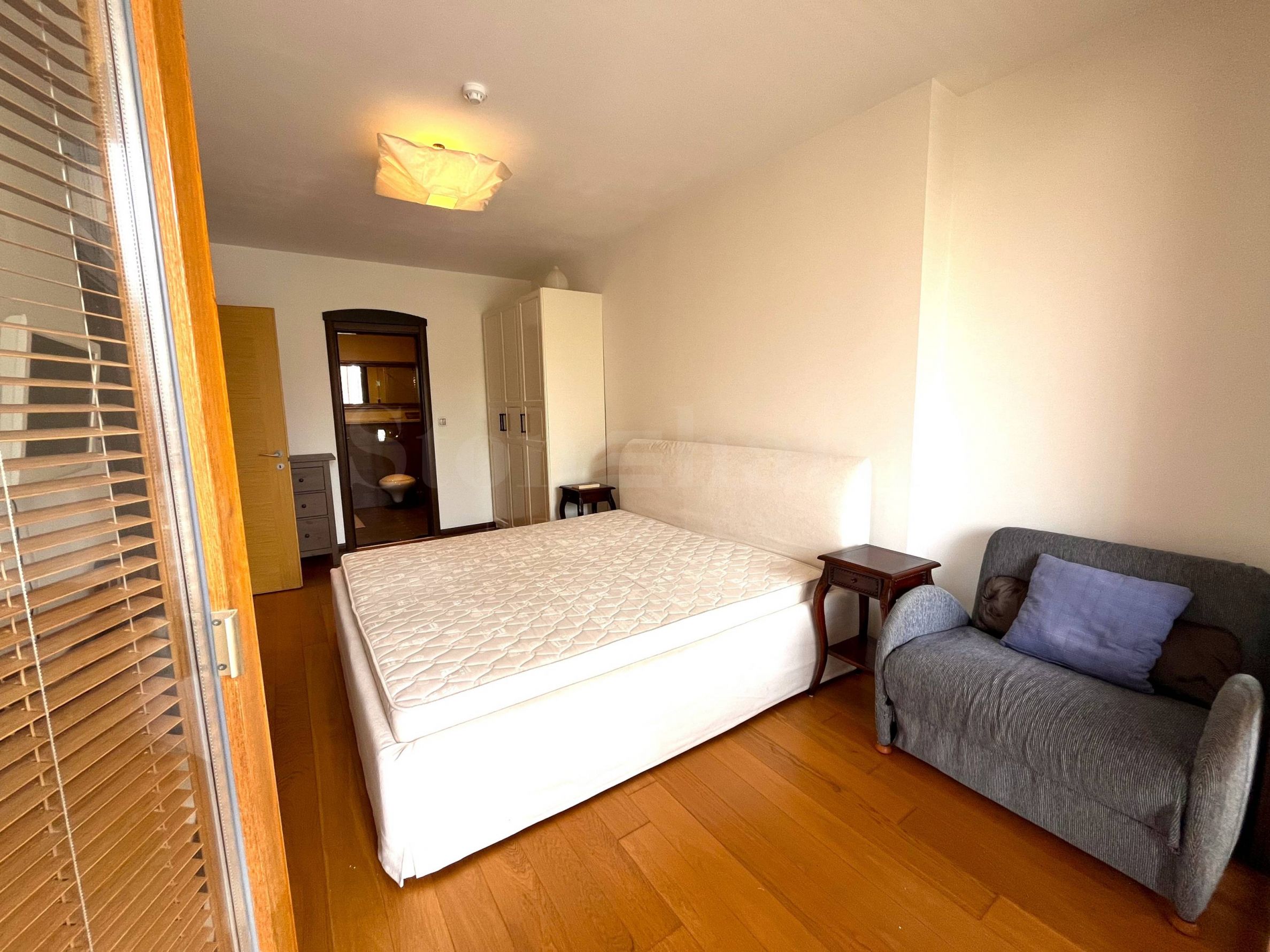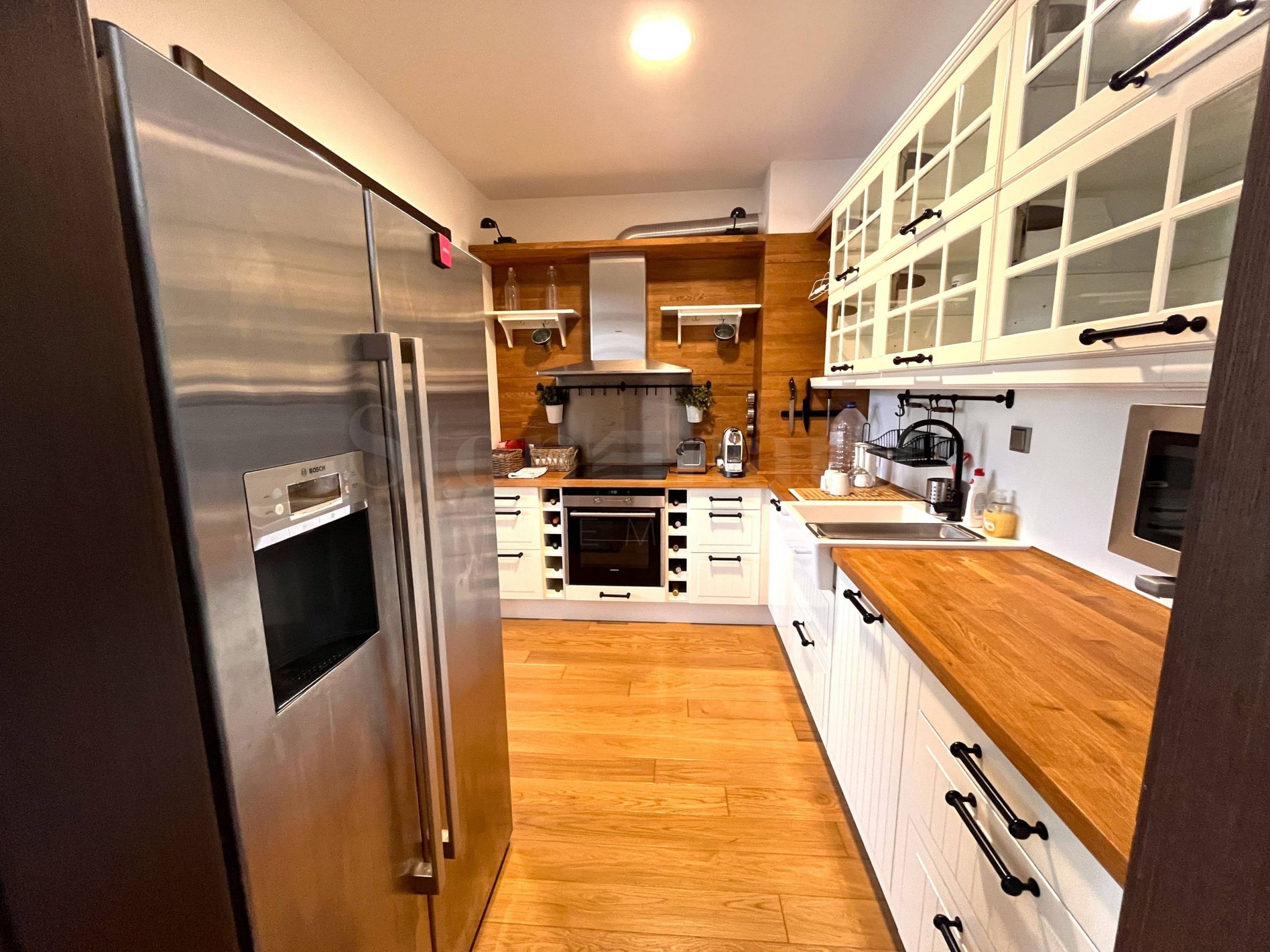 две тераси. Жилището е напълно обзаведено и оборудвано с модерни и комфортни мебели, висок клас уреди и с внимание към всеки детайл. Дограмата е от евкалиптово дърво и предлага отлична шумоизолация, а подът е с трислоен естествен паркет.