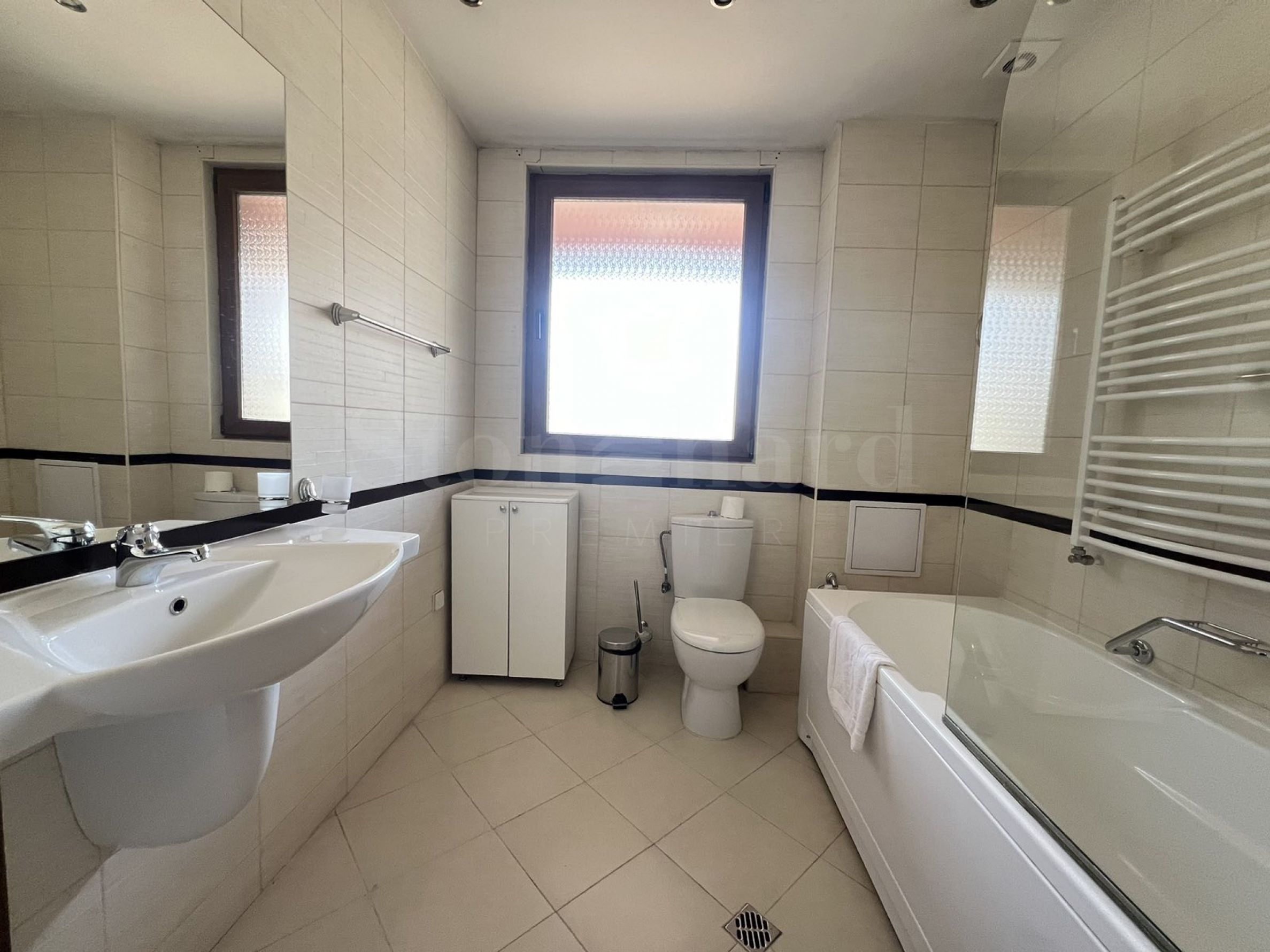 Две бани, едната с вана и тоалетна, а другата с душ кабина и тоалетна;