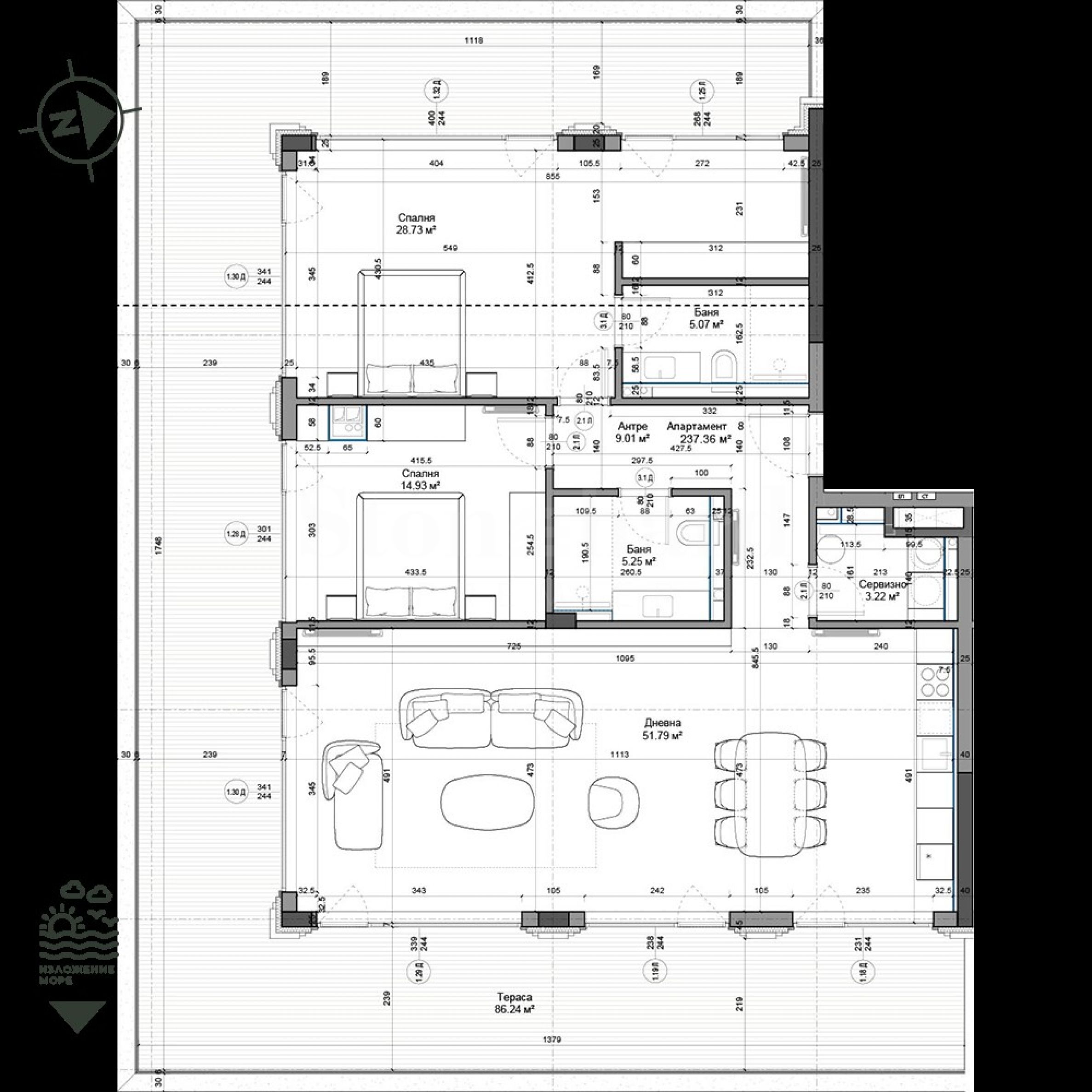 • просторна дневна с кухня и трапезария - 51.79 кв.м;