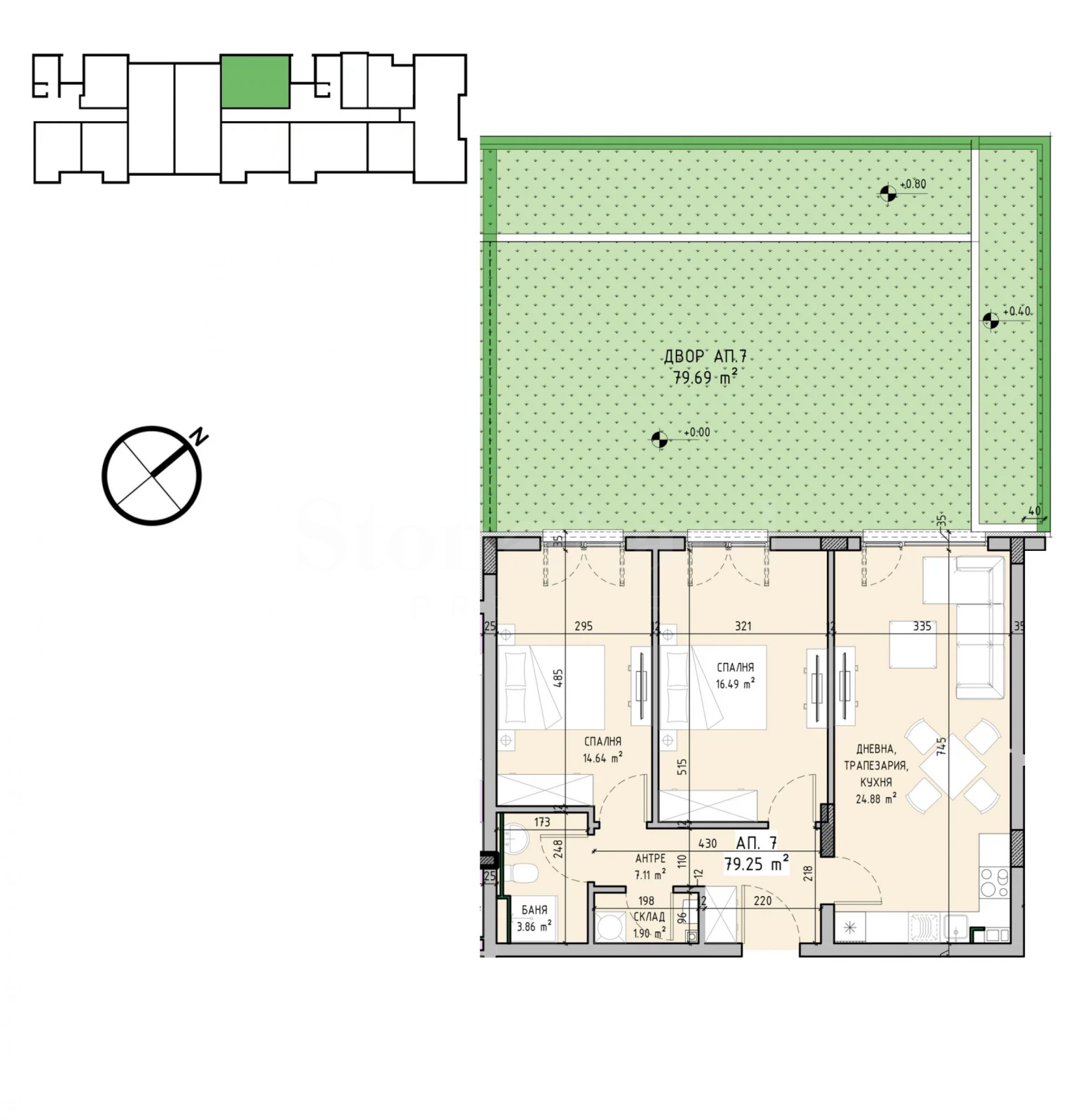 Апартаментът е разположен на партерен етаж, с чиста площ 79.25 кв.м и включва: