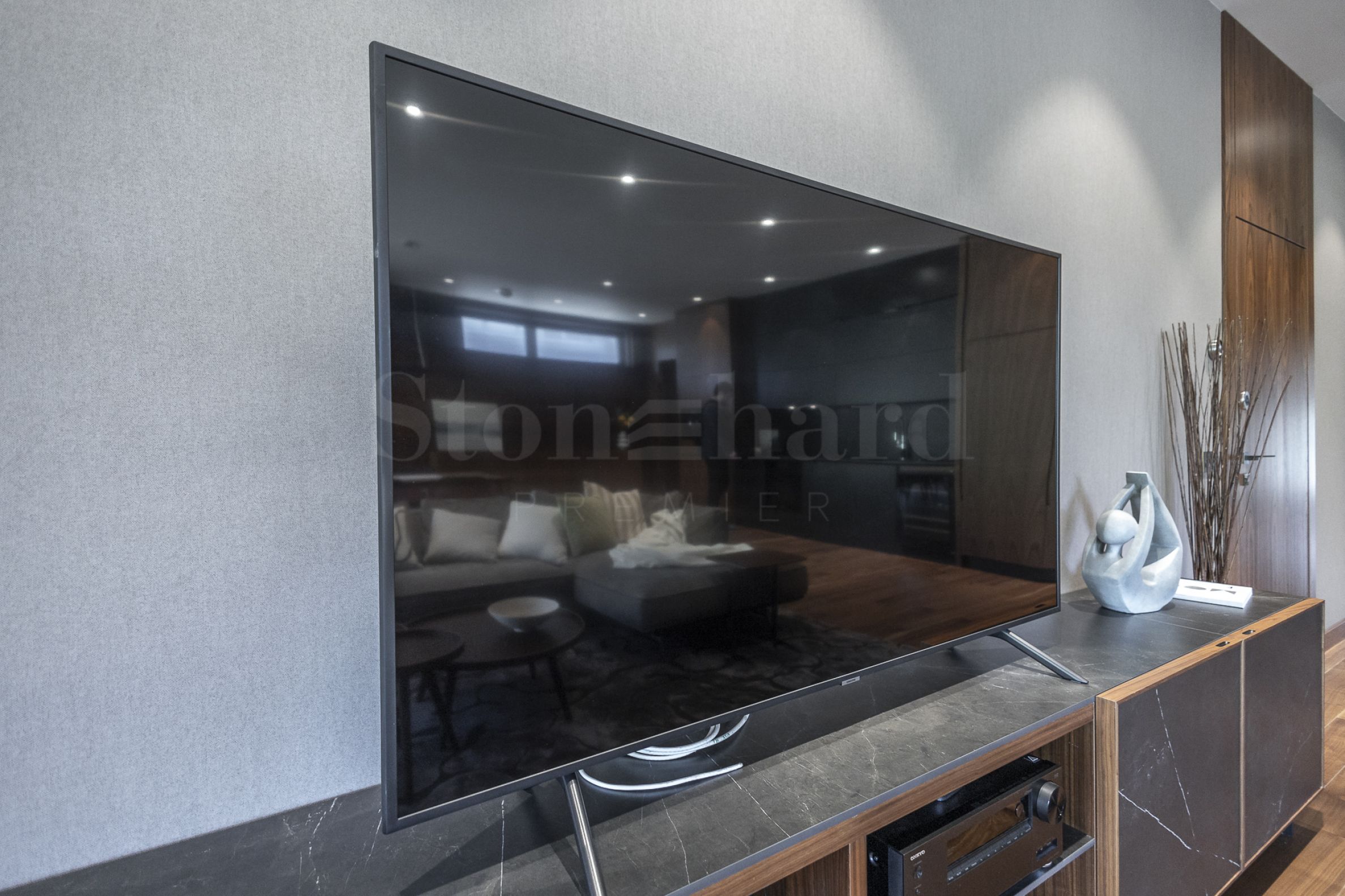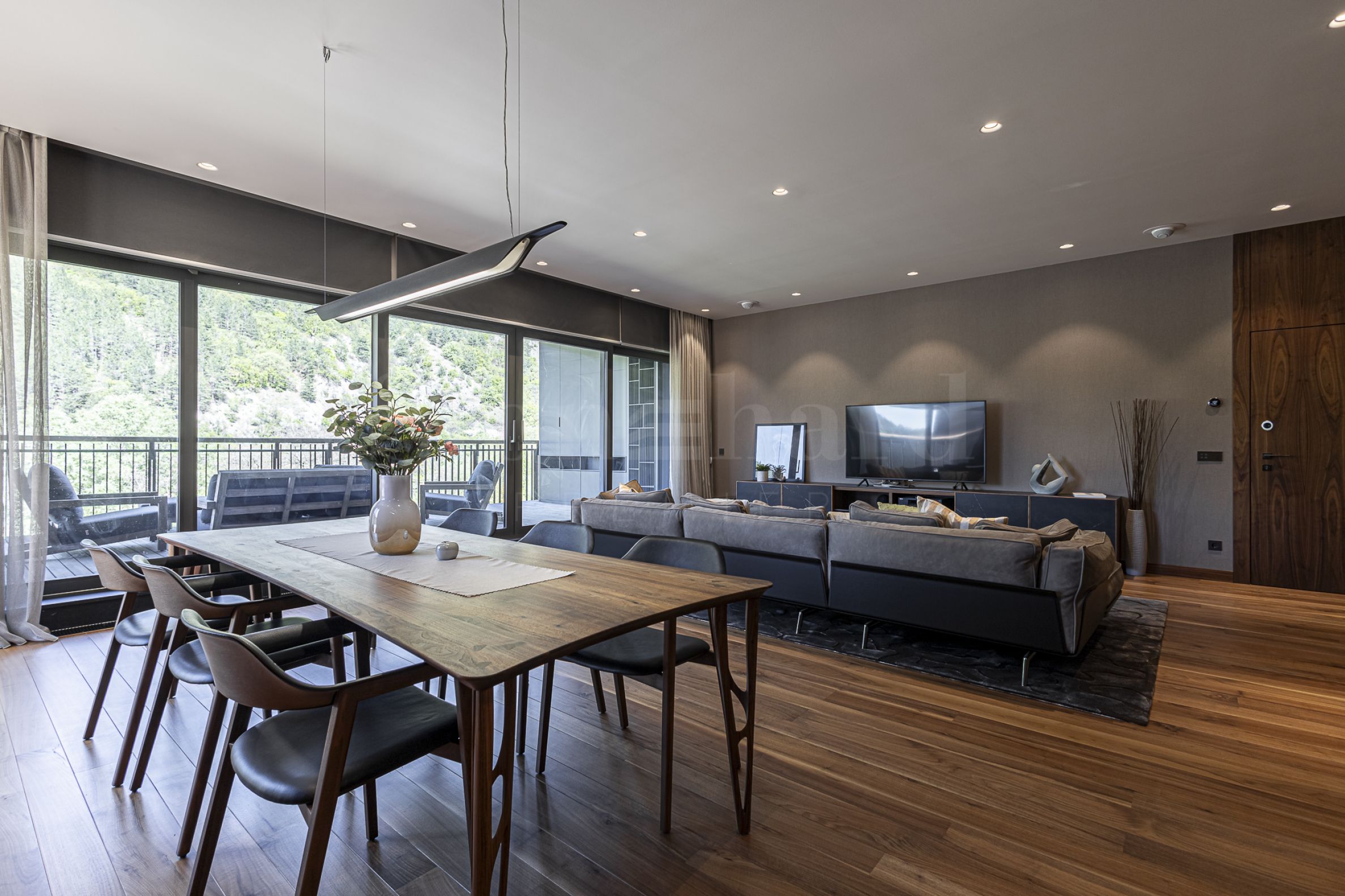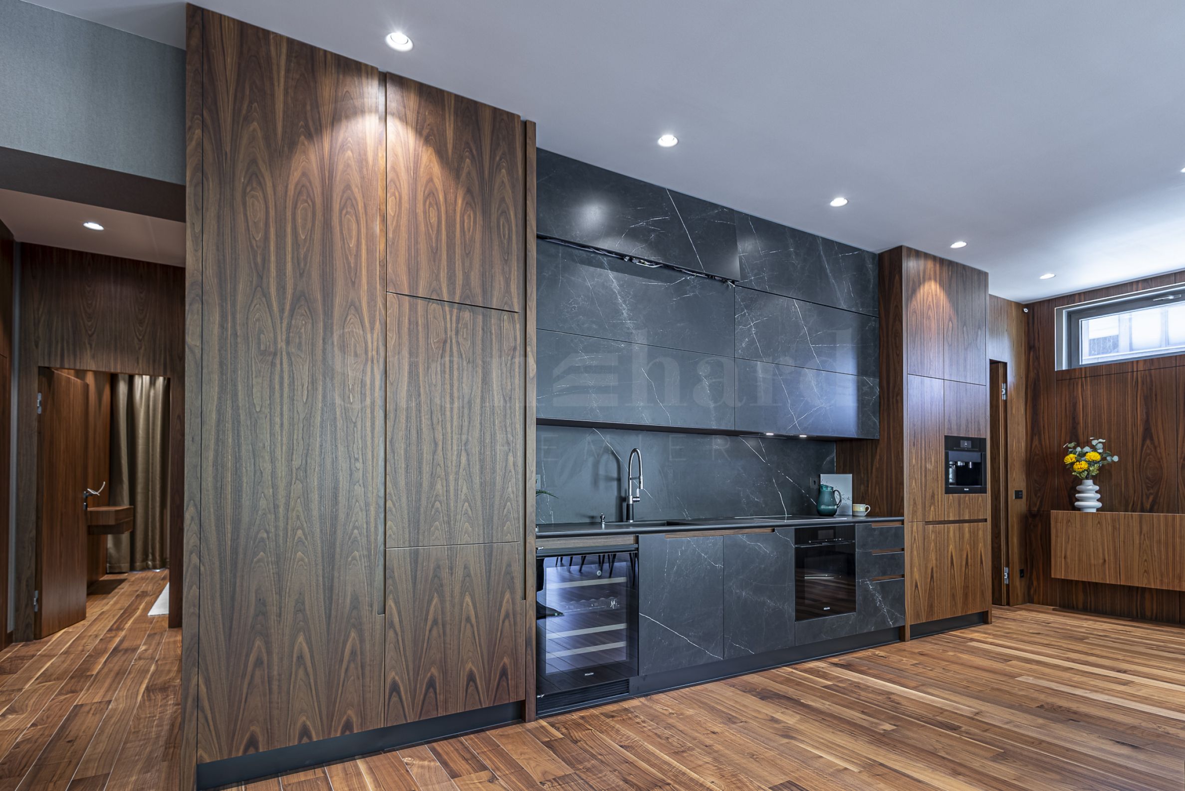 Апартаментът е завършен и обзаведен с най-висок клас материали, мебели и уреди. В дневната е монтирана модерна и функционална кухня с вградени уреди Mielе. Всички помещения освен баните са завършени с подова настилка от естествен паркет.