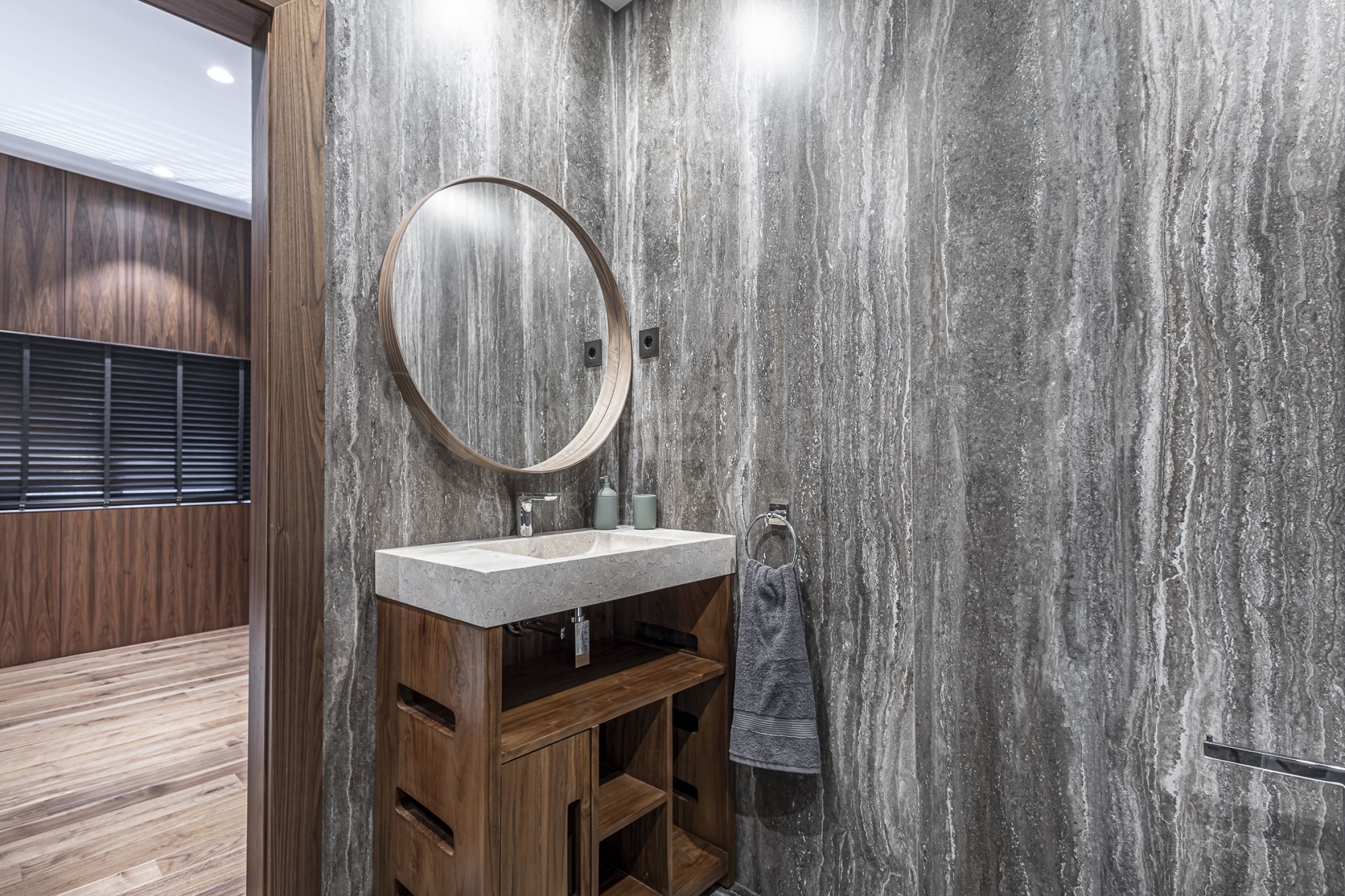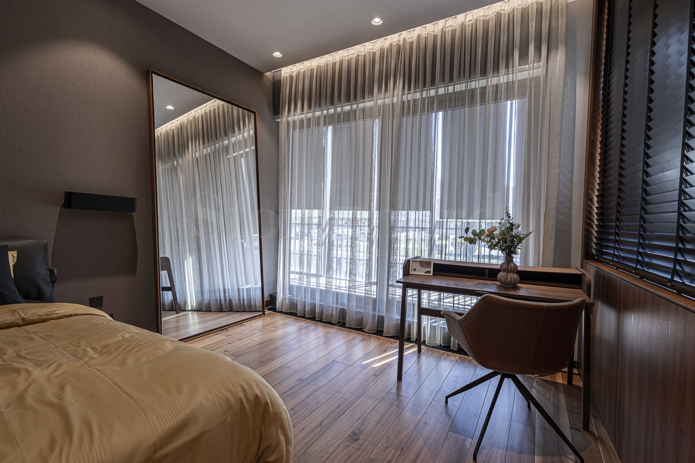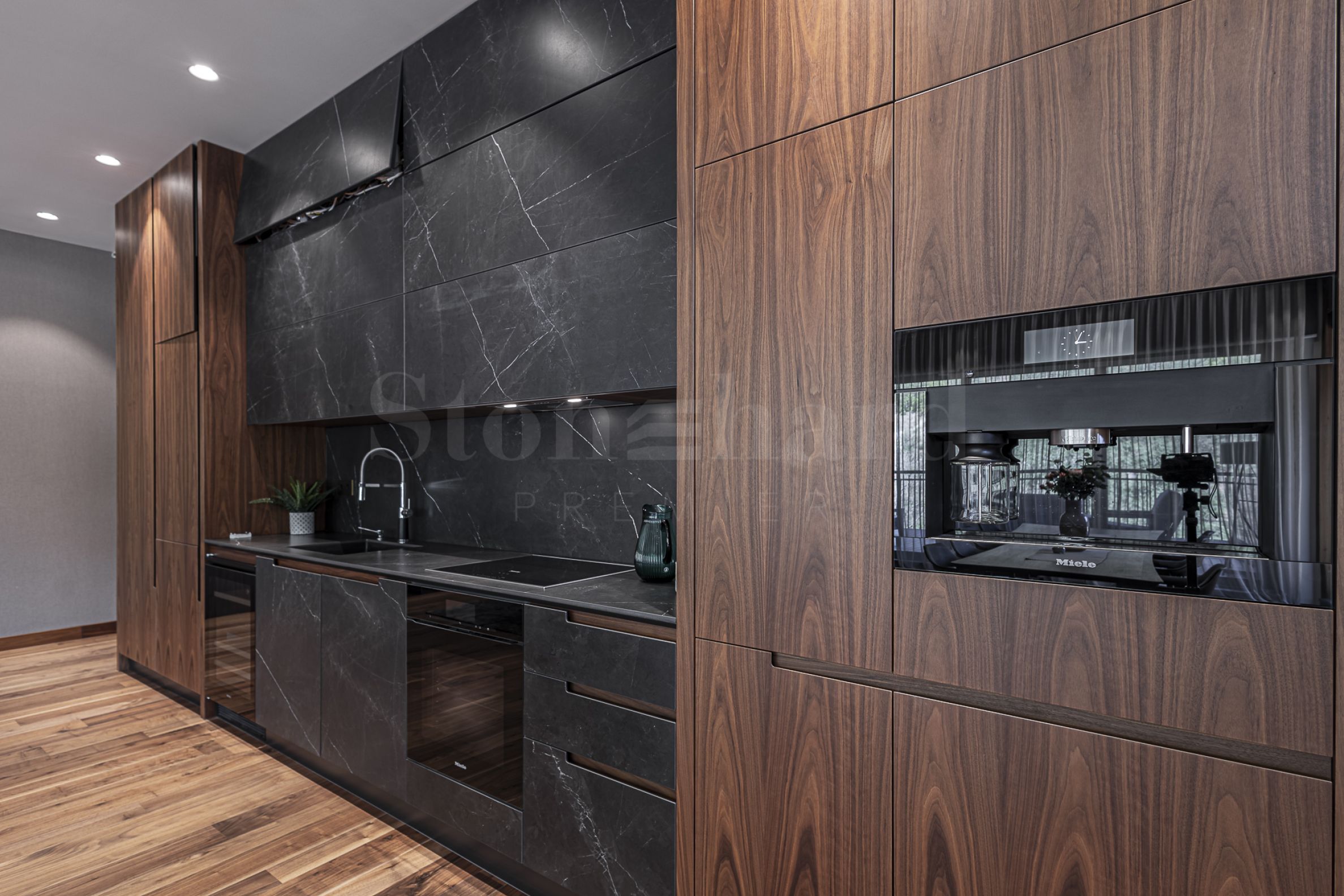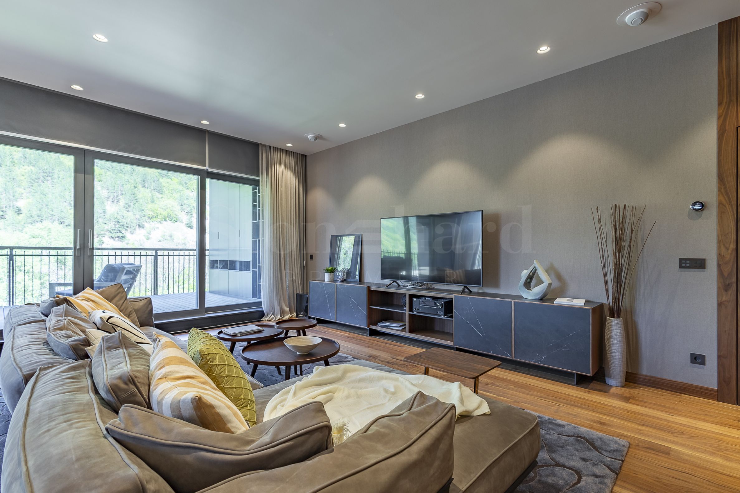 Апартаментът е завършен и обзаведен с най-висок клас материали, мебели и уреди. В дневната е монтирана модерна и функционална кухня с вградени уреди Mielе. Всички помещения освен баните са завършени с подова настилка от естествен паркет.