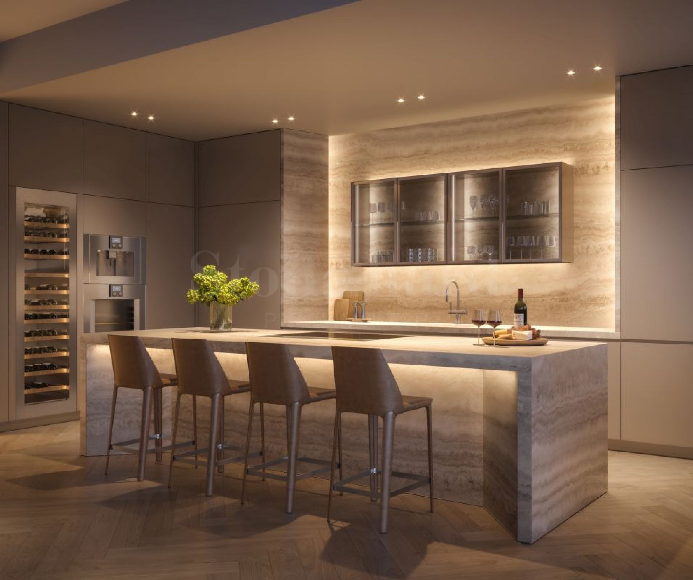 Мрамор Statuario Nero (черен).Всички електроуреди в кухнята са на бранда Gaggenau, които доказал се във времето бранд за производство на висок клас техника.
