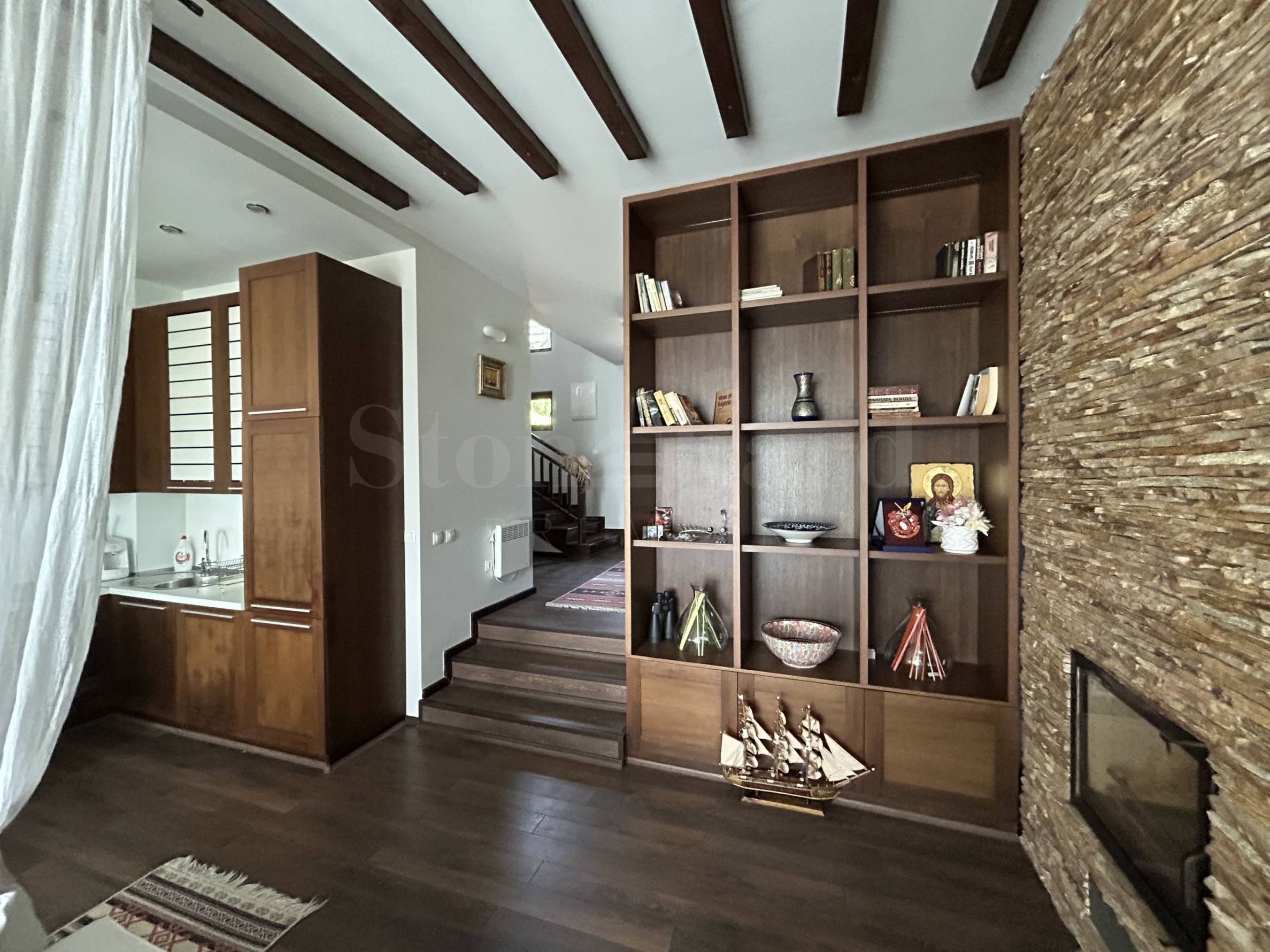 • първи етаж: антре/веранда, всекидневна и кухненски бокс, веранда с градина, баня/тоалет, складово помещение, стълбище към втори етаж;