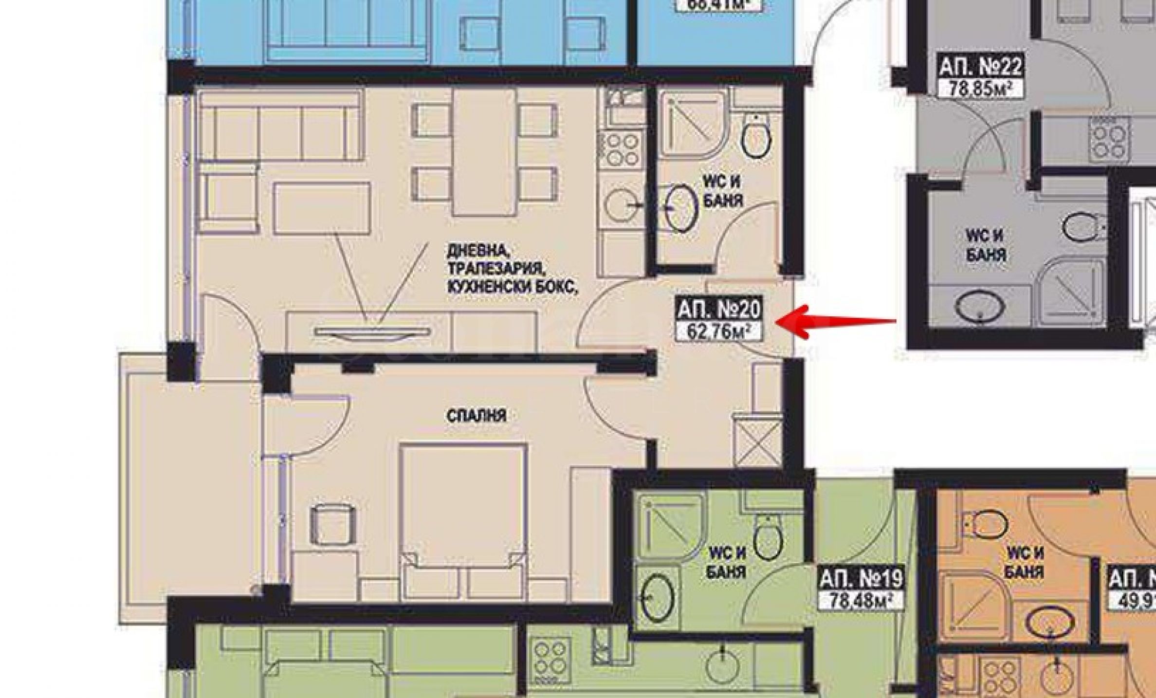 Площи на жилищата: 62.76 м2