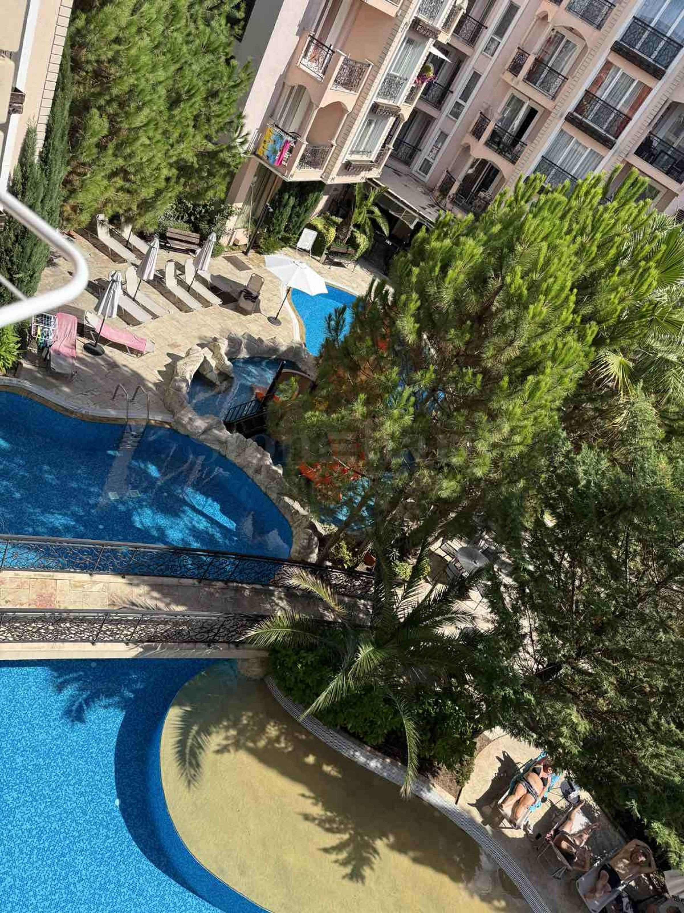 Имотът е с обща площ от 52 кв.м, разположен на 4-ти етаж с тераса и гледка към басейна.