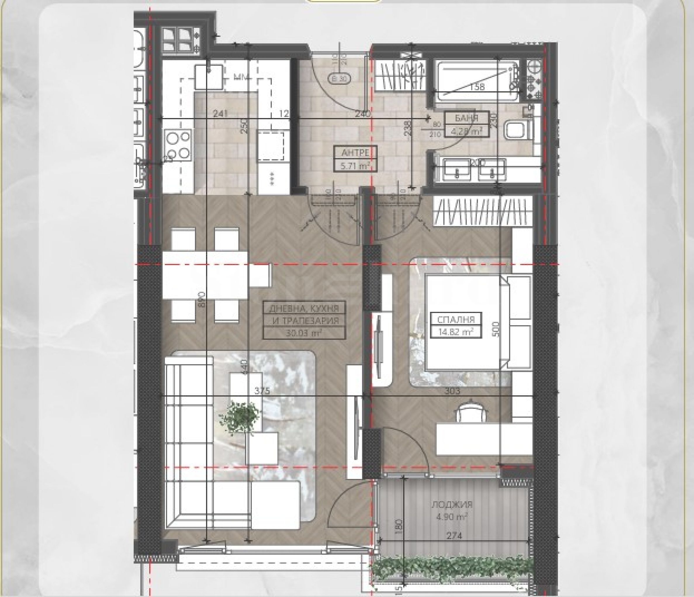 Апартамент №А503 е разположен на 5-и етаж и има изложение на юг. На чиста площ от 70.08 кв.м са разпределени: антре, баня с тоалетна, просторна дневна с кухня и трапезария, спалня, тераса с излаз от двете стаи.