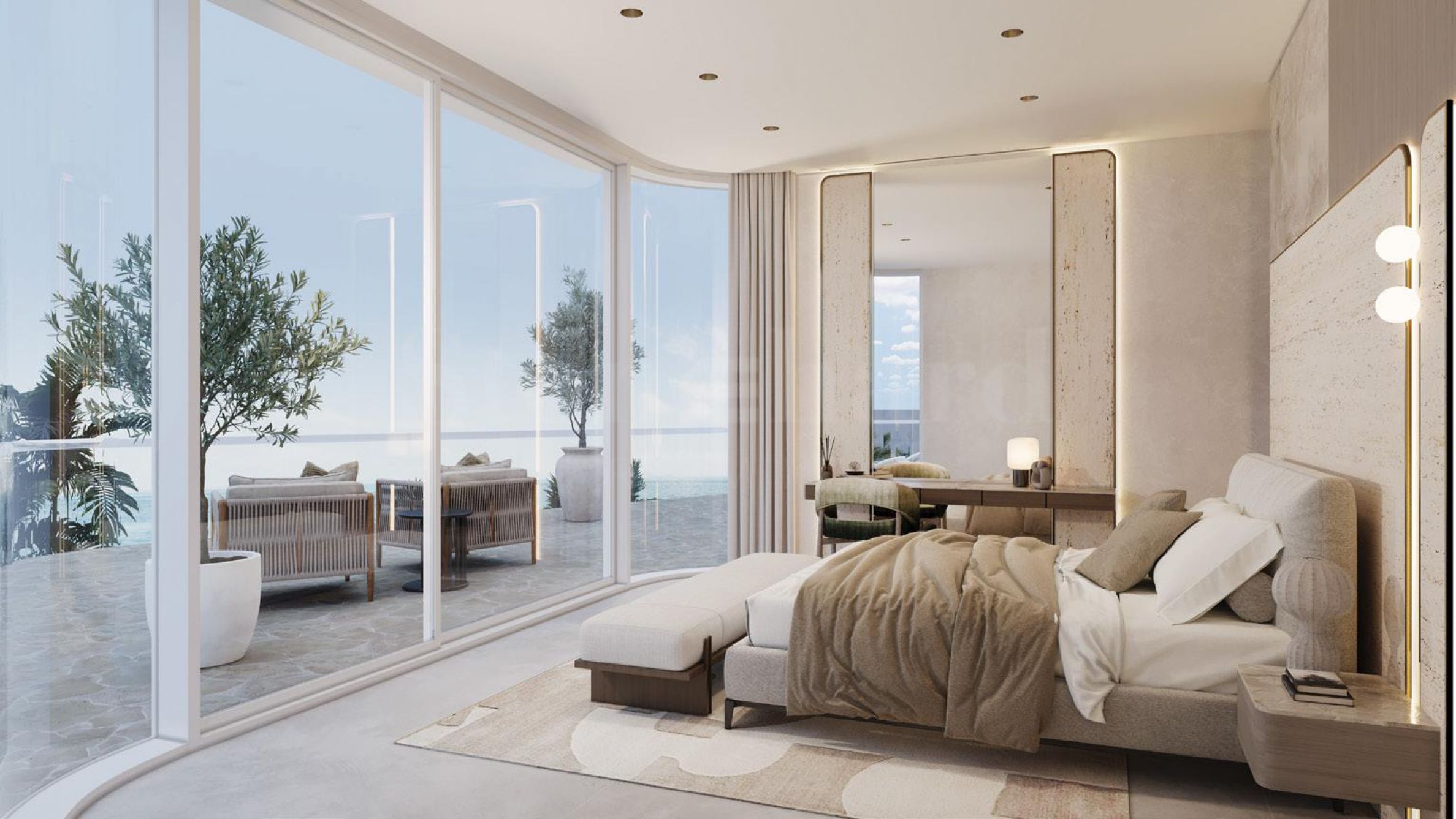 Интериорът е изграден с изключително внимание към детайла – високите тавани и панорамните прозорци от пода до тавана създават усещане за лекота и връзка с морето, което се превръща в част от ежедневието.