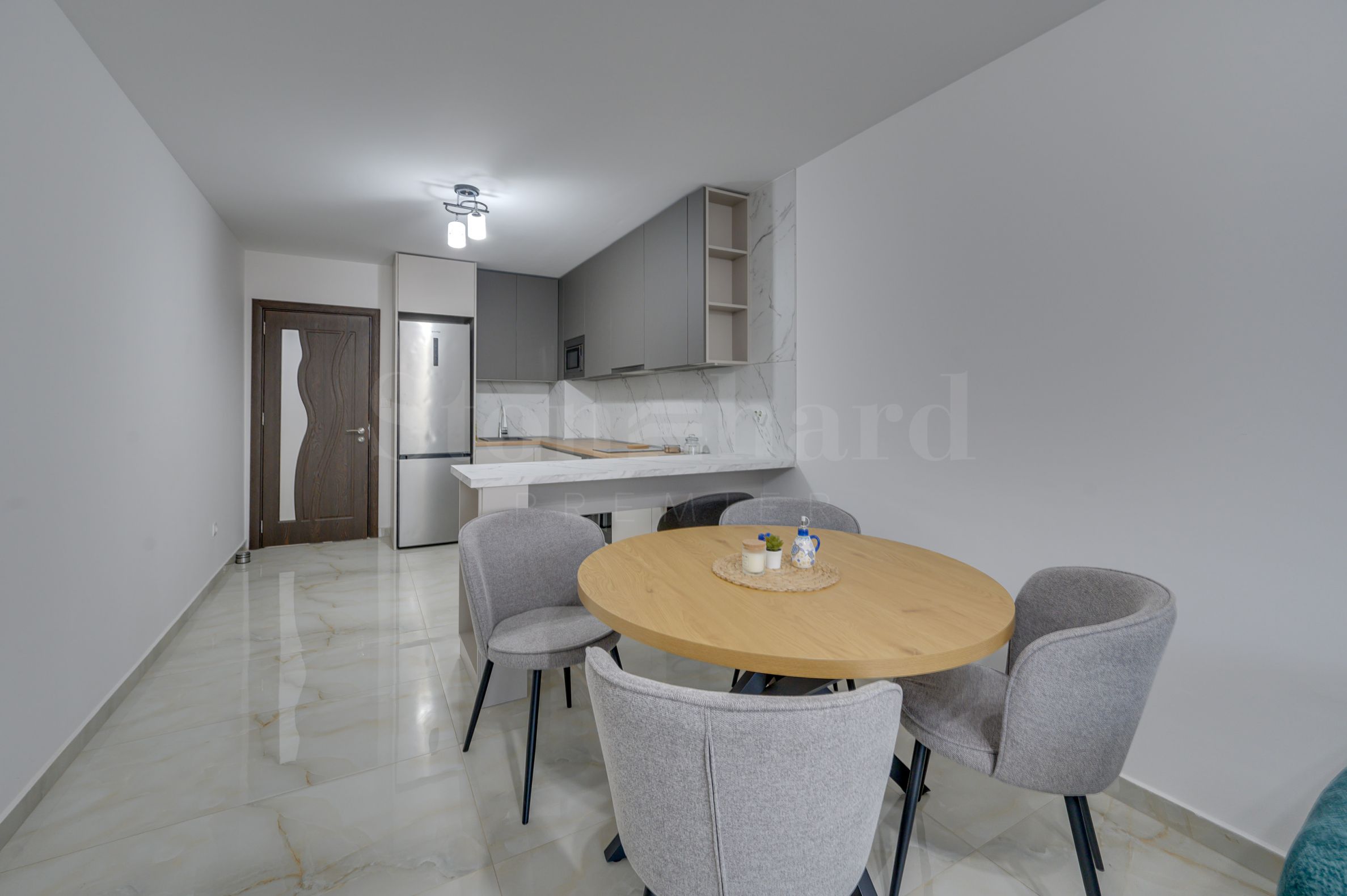Апартаментът е обзаведен с внимание към детайла и предлага готова, завършена среда за живеене без нужда от допълнителни инвестиции. Интериорът е изпълнен в съвременен стил, с качествени мебели и уреди.
