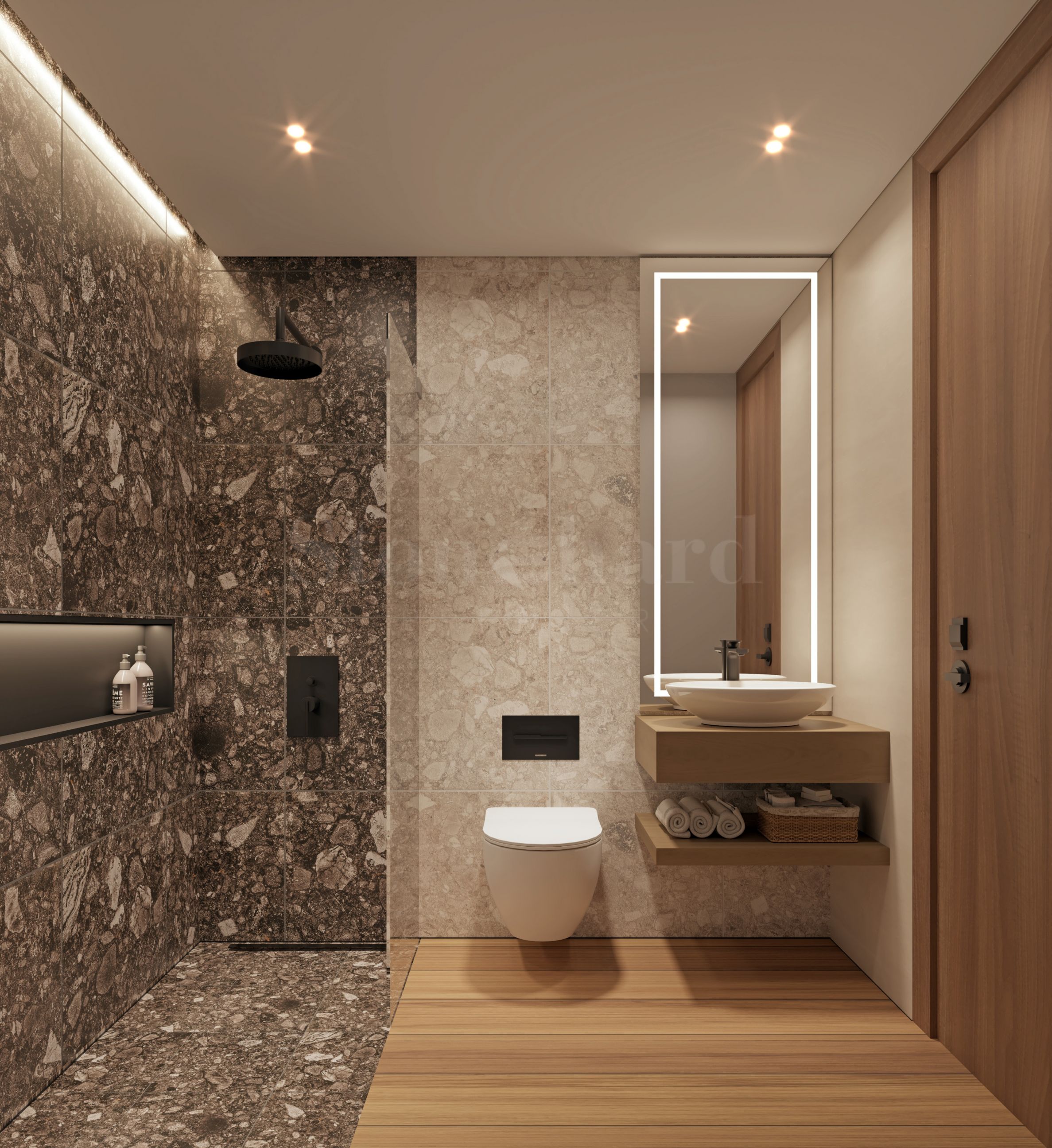 В банята стените в душ-зоната са изпълнени с керамични или порцеланови плочки, а останалите стени са боядисани с винилова боя. Шкафът под мивката е от MDF с покритие от меламин или термозалепваща Formica, а всички аксесоари и фитинги са изработени от неръждаема стомана, осигурявайки устойчивост и елегантна естетика.