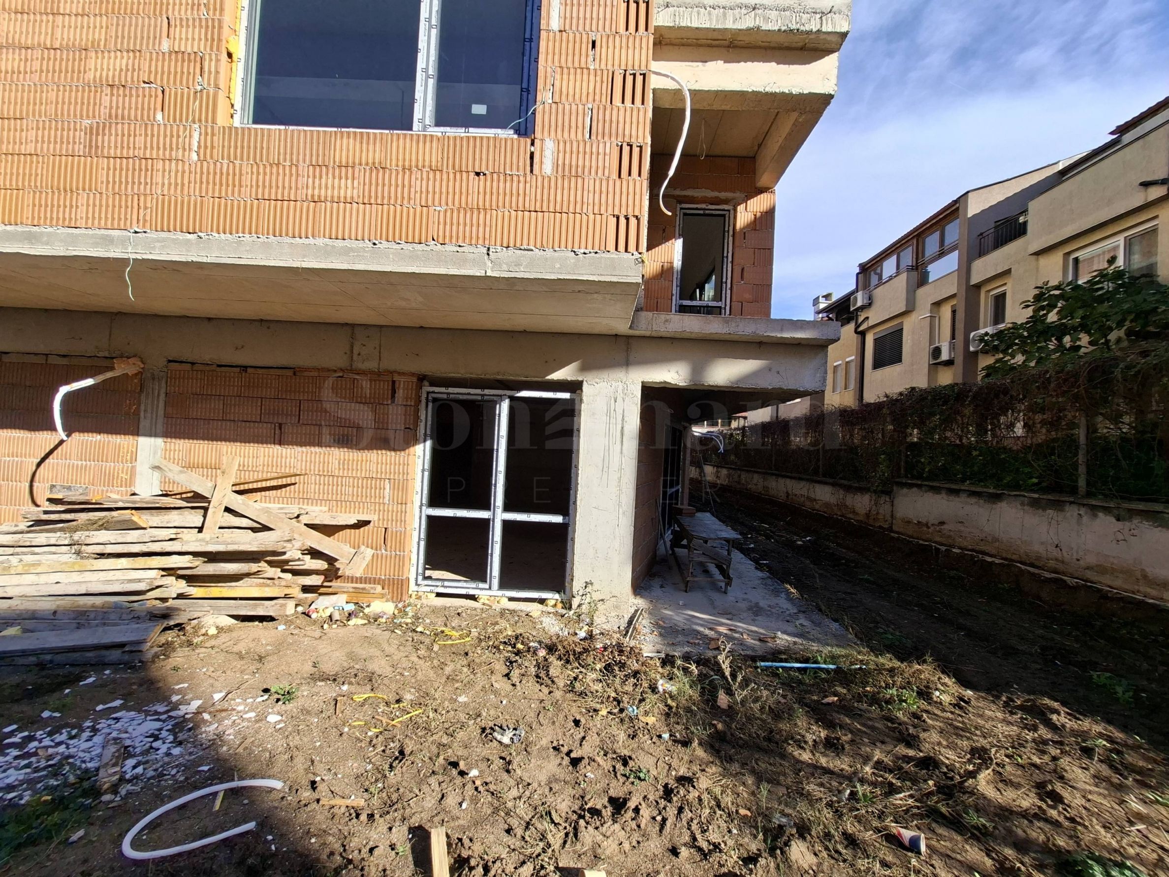 • вътрешни стени: тухлена зидария, мазилка, фина шпакловка и бял латекс.