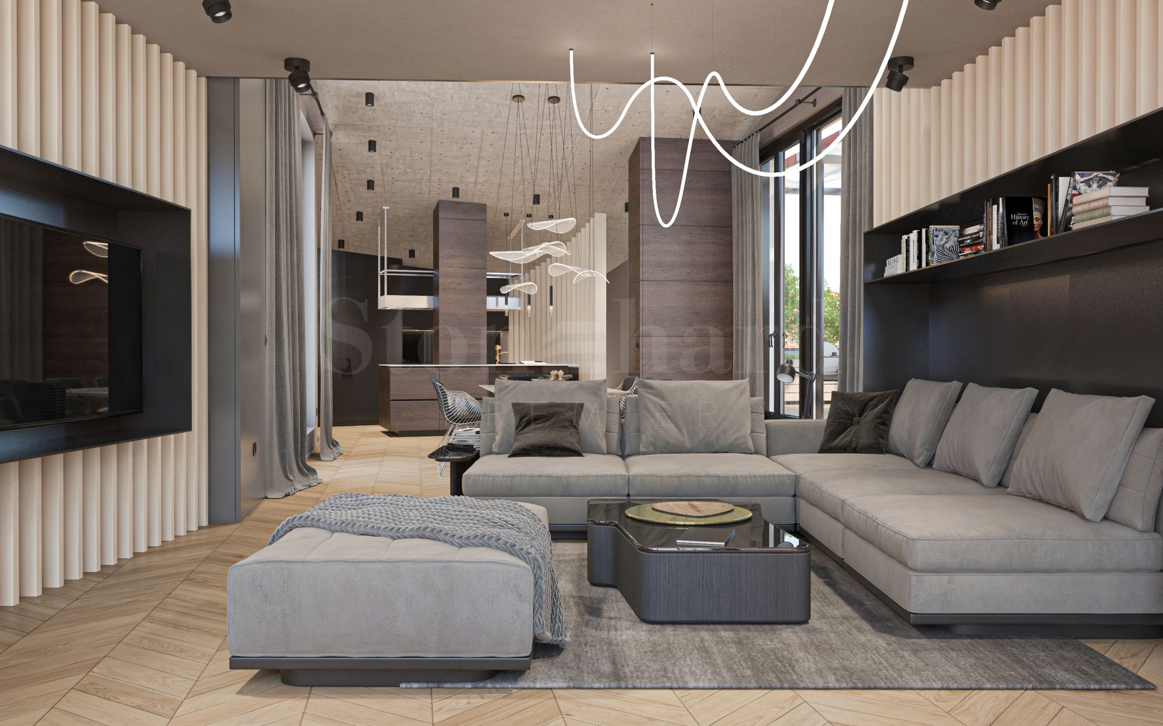 • Впечатляваща дневна с трапезария и кухненски бокс (височина до 5.50 м);