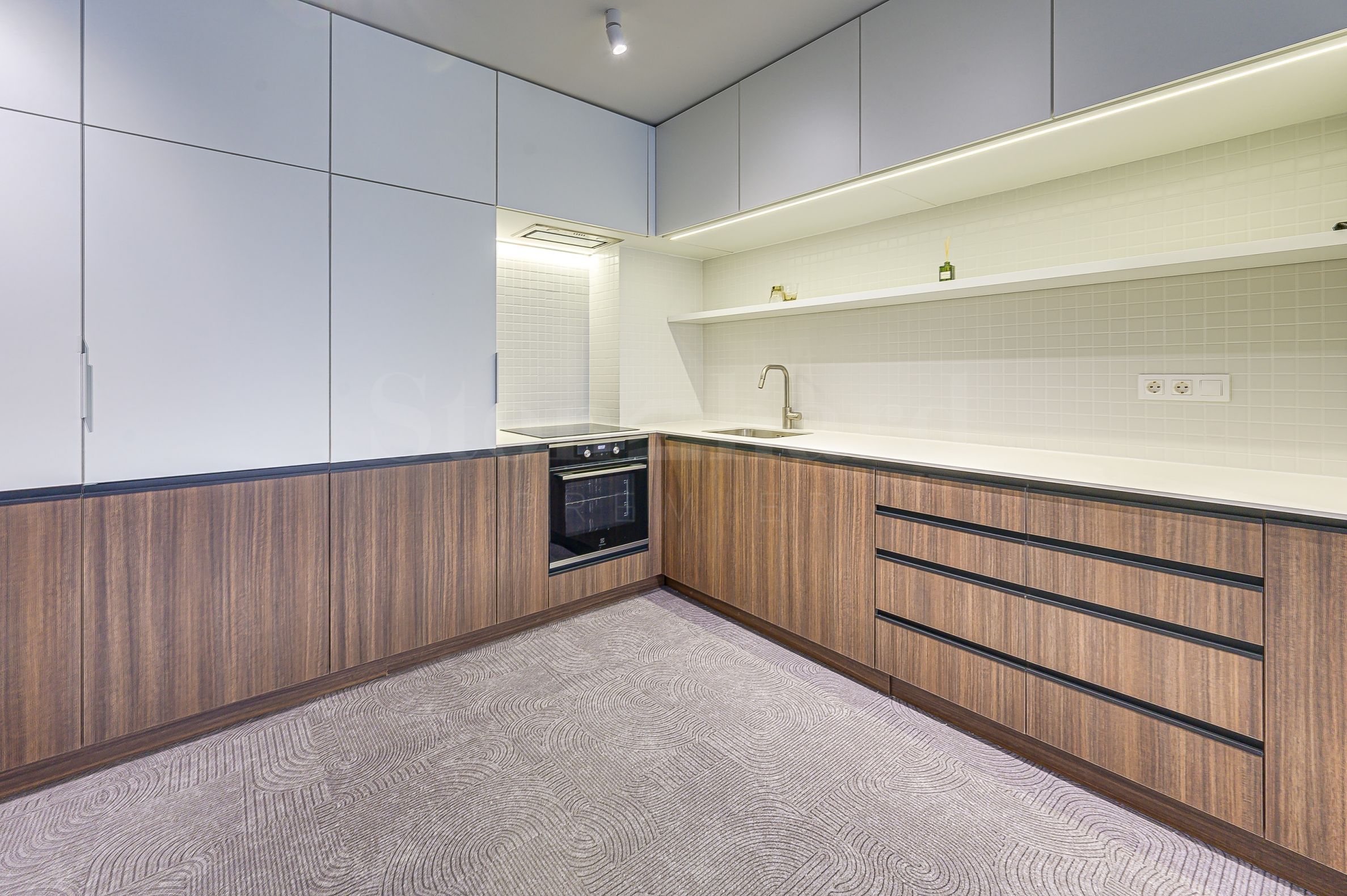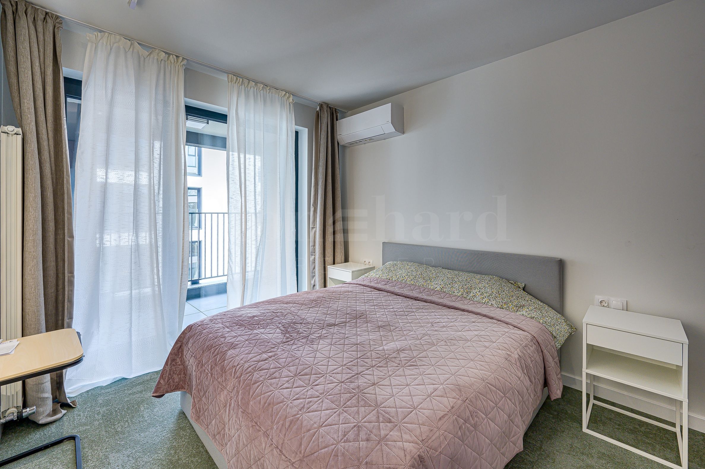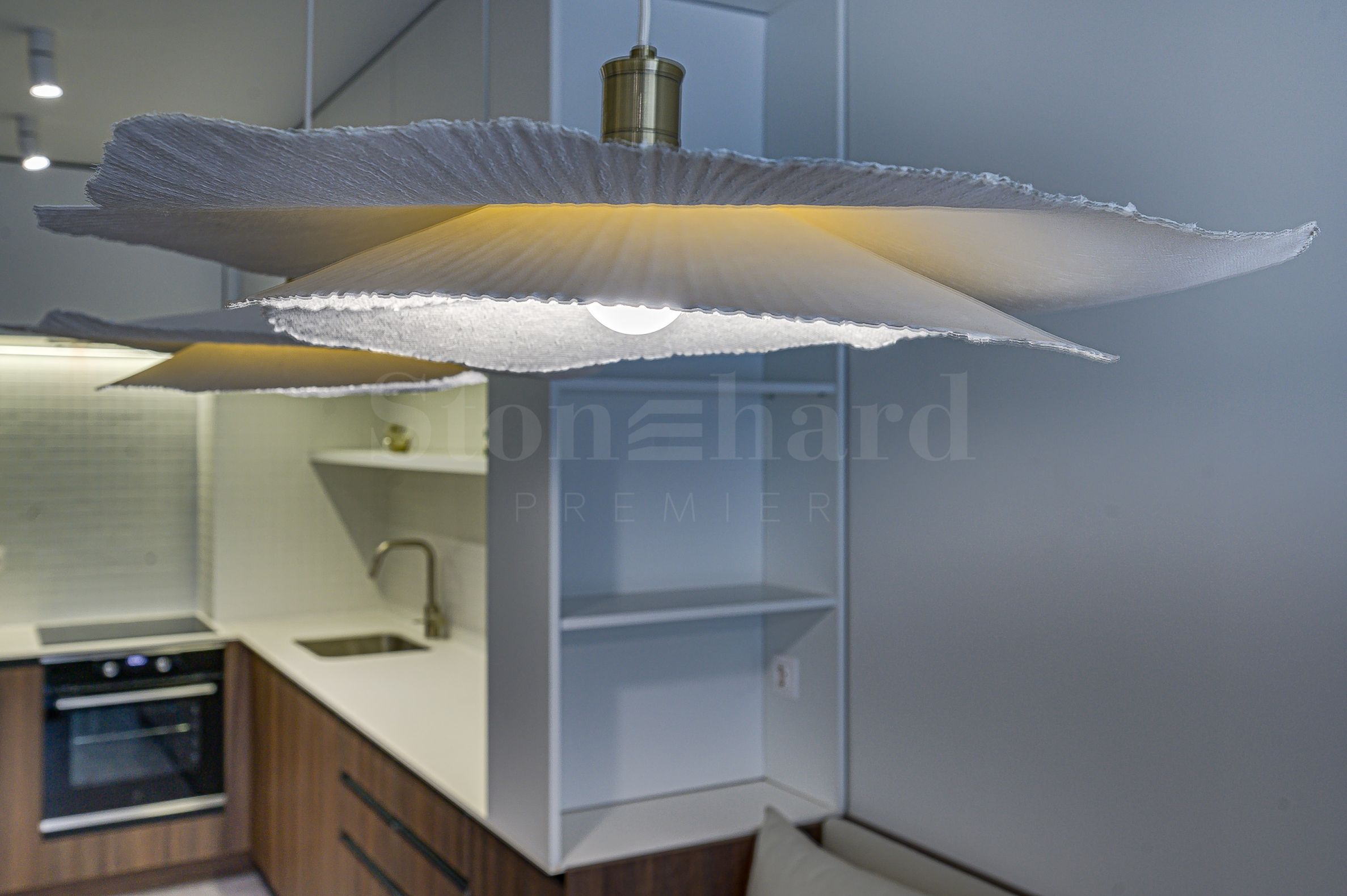 Апартаментът е реализиран по индивидуален проект – всичко е ново, подбрано с внимание към детайла и усещане за елегантен минимализъм. Пространствата са балансирани и функционални.