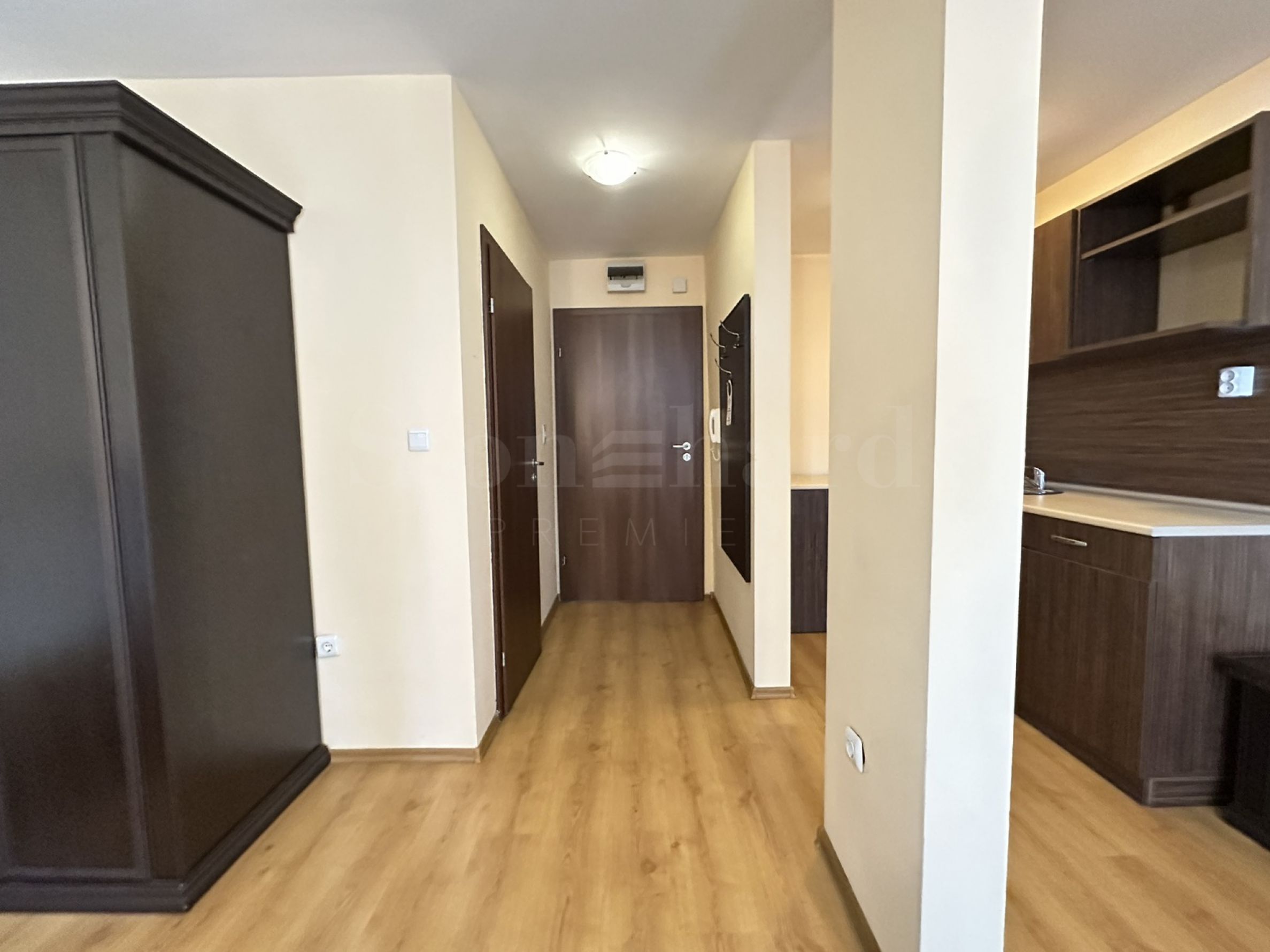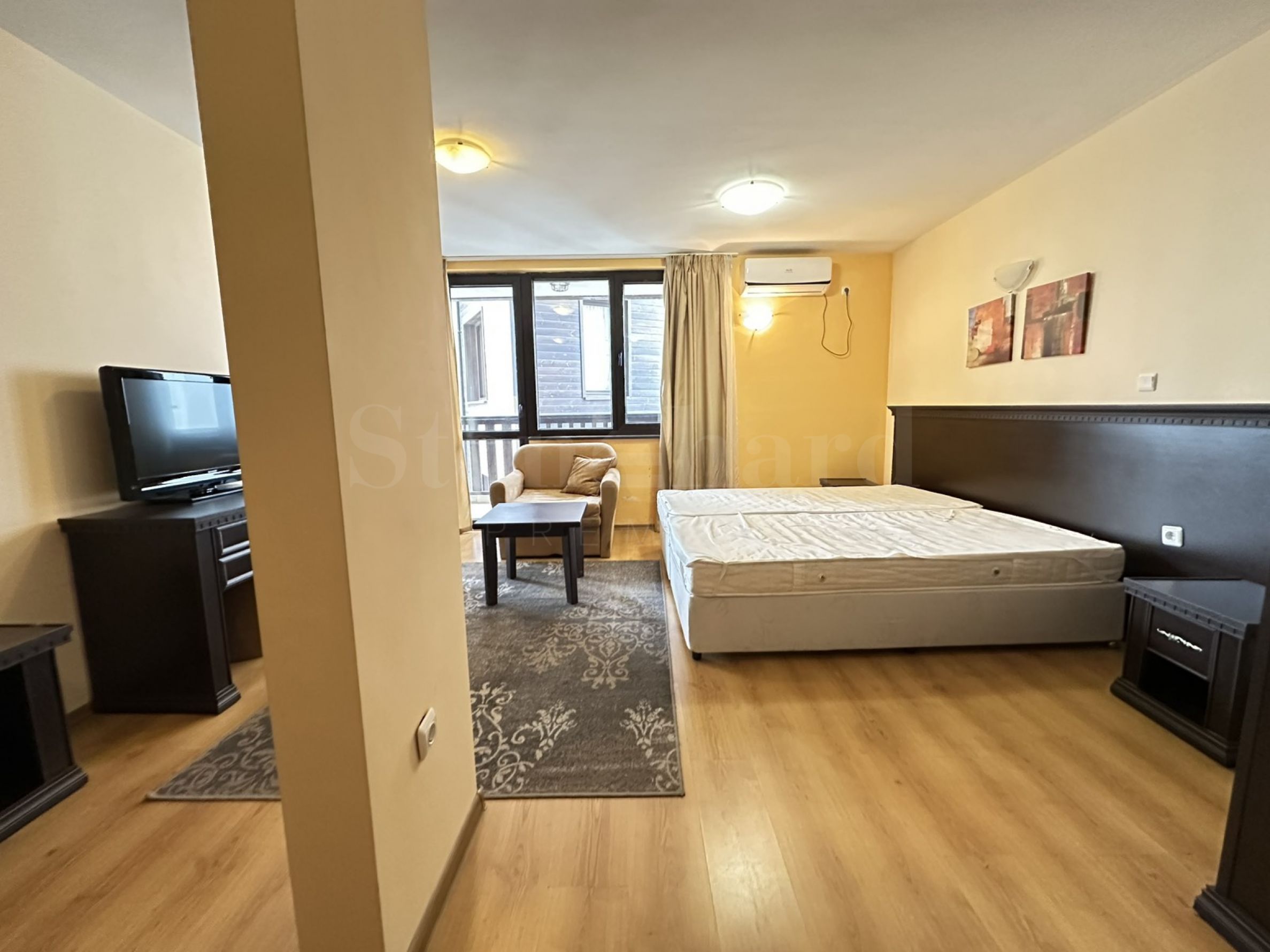 • Просторно основно помещение, обединяващо: оборудвана кухня, голяма спалня, гардероб, шкаф с плазмен телевизор;