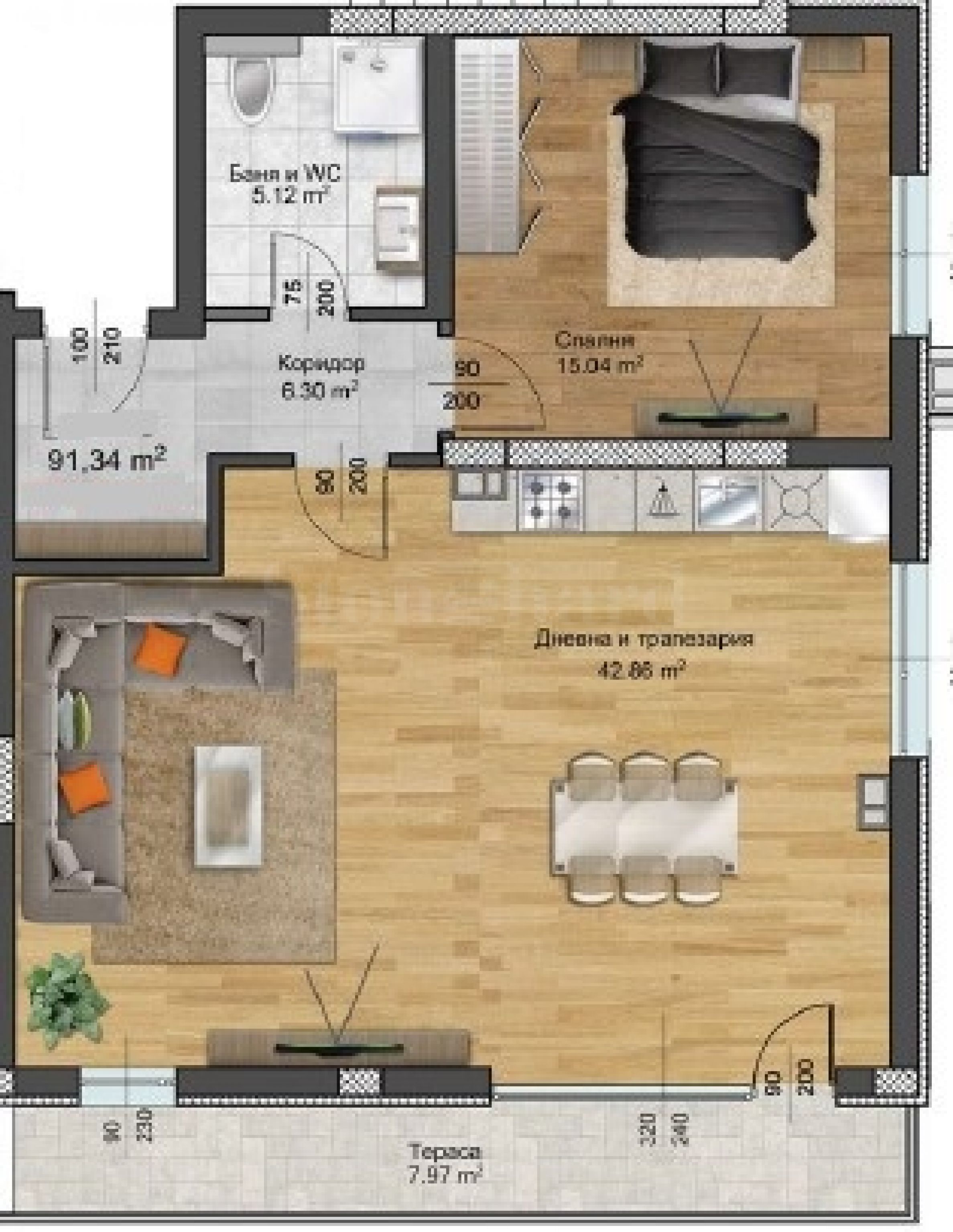 просторна дневна с трапезария и кухня - 42.86 кв.м;