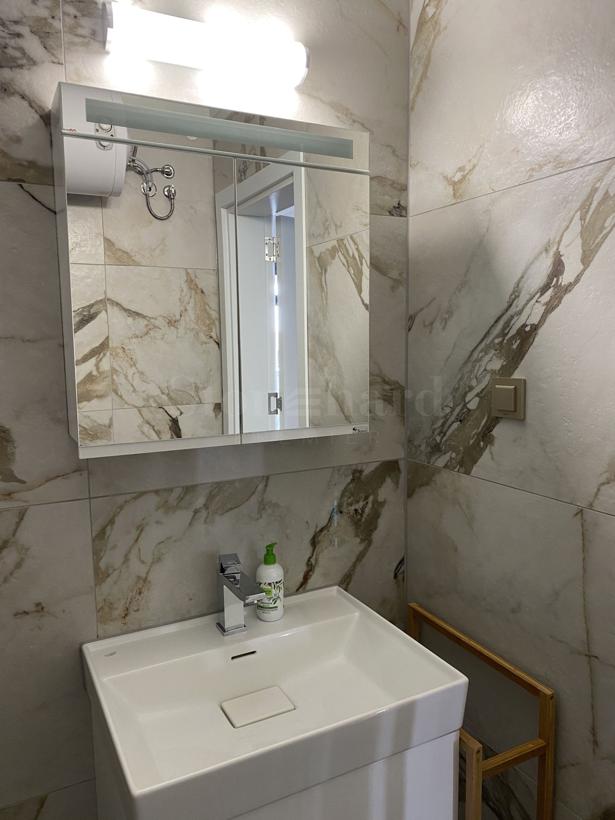 designová koupelna s toaletou, mokrý prostor/komora s pračkou a sušičkou, s vestavěným odvlhčovačem a dalšími prvky.