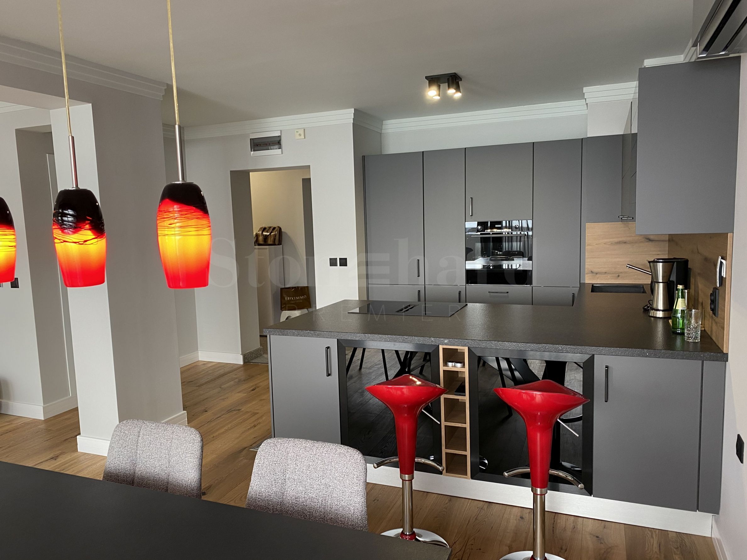 moderní německá vestavěná kuchyně s přístroji Bosch: myčka, trouba, lednice-mrazák a odsavač Bosch, kamenná pracovní deska;