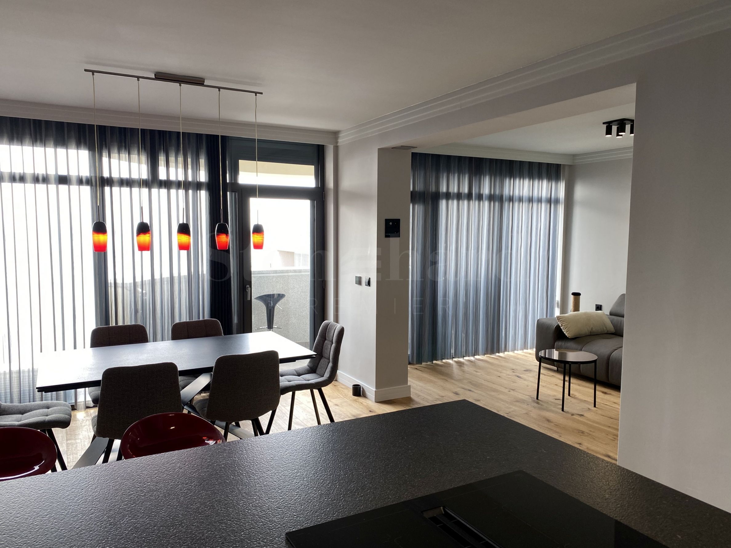 panoramatická okna s hliníkovými rámy s elektrickými žaluziemi v barvě, s dálkovým ovládáním a posuvnými systémy na lodžii;