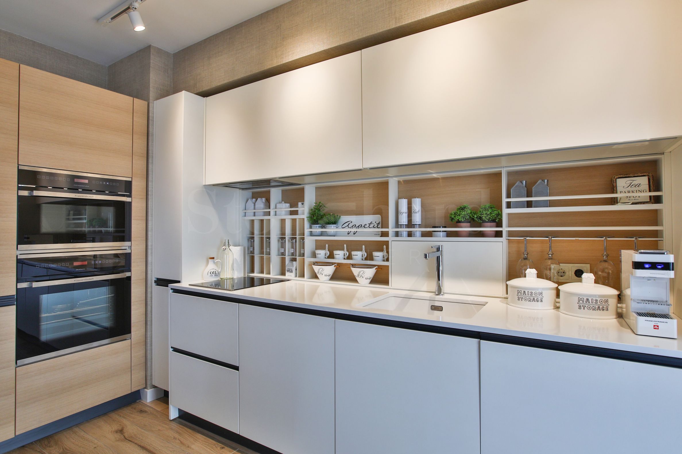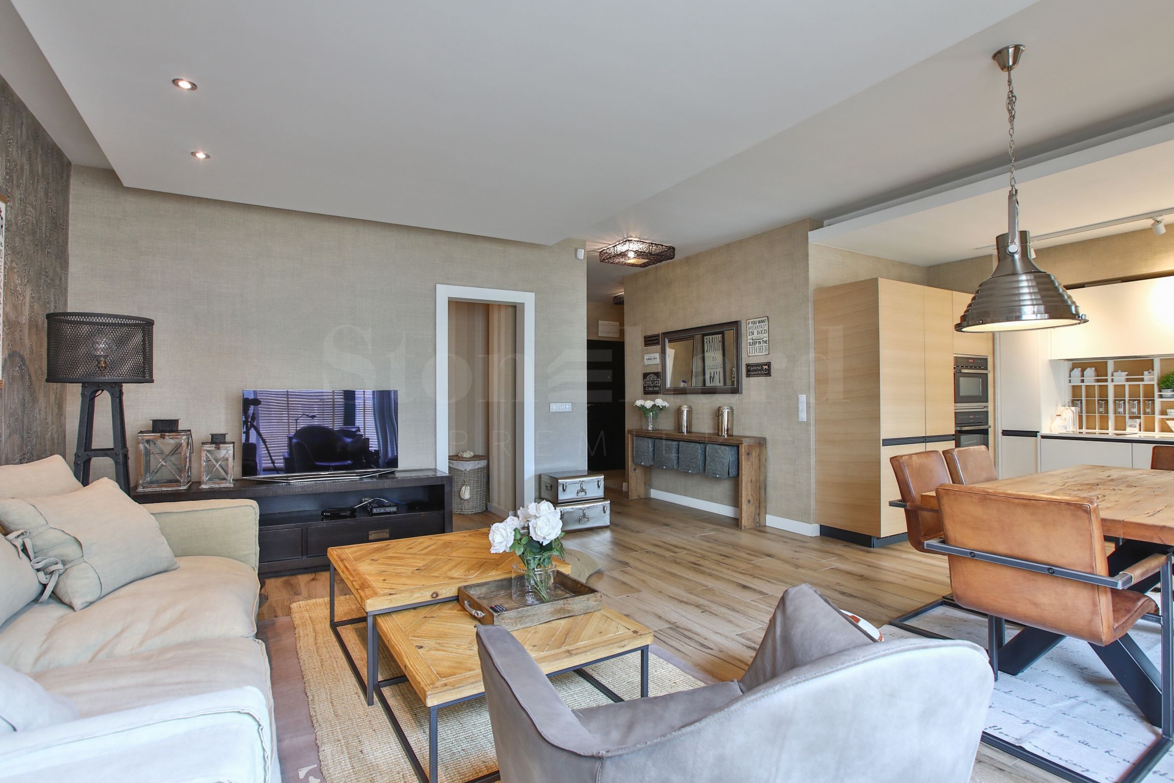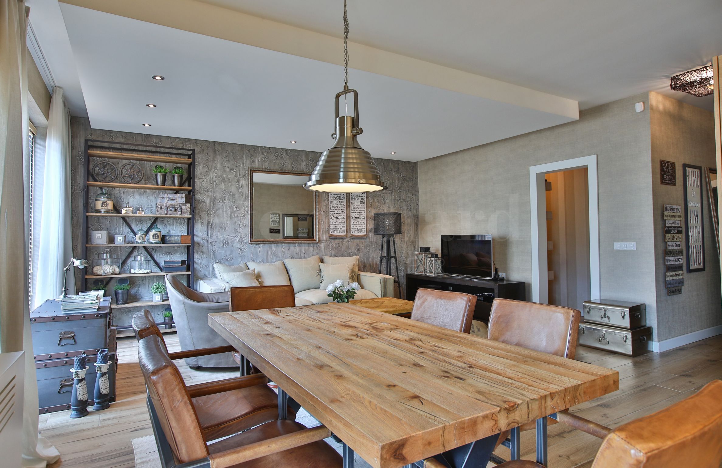 Byt je laděn ve vintage stylu a zařízen podle designového projektu s kvalitním nábytkem, většina na zakázku.