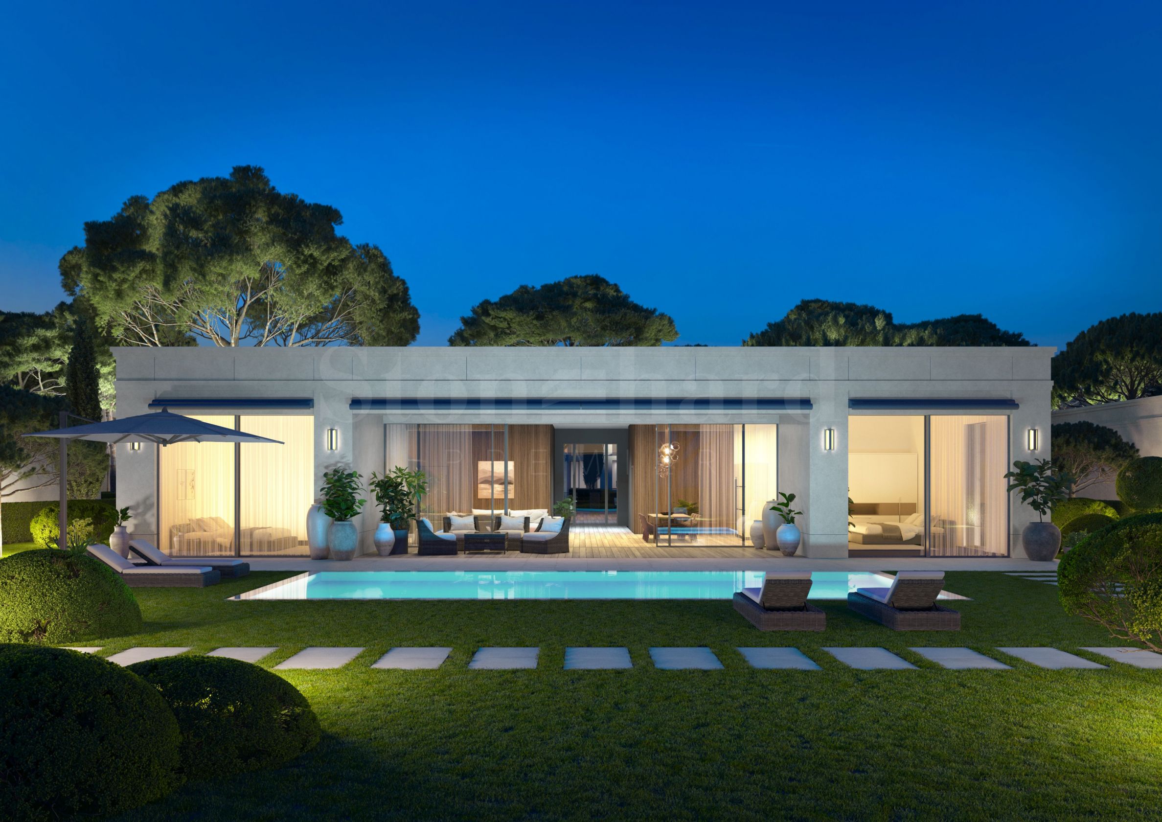 • na první linii – 9 jednopodlažních vil, každá s vlastním dvorem a možností bazénu, s 3 venkovními parkovacími místy;