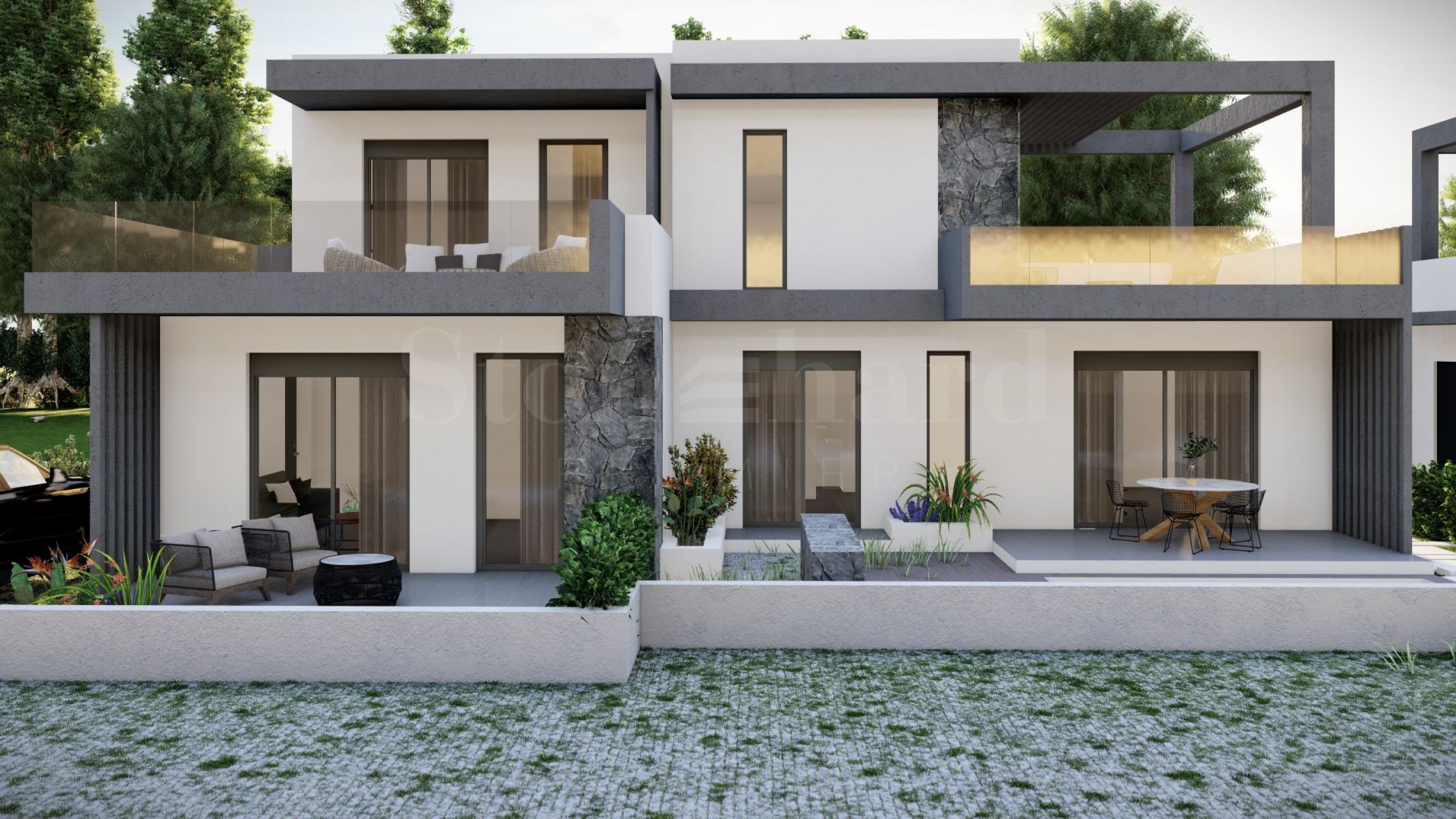 9 dvoupatrových domů na dvou úrovních o rozloze 74,02 m², sestávajících z obývacího pokoje s kuchyňským koutem, 2 ložnic, 2 koupelen a bazénu ve dvoře. Všechny nemovitosti jsou dodávány kompletně „na klíč“, s instalovanou podlahou, vstupními dveřmi, interiérovými dveřmi, s vestavěnou kuchyní a vybavenou koupelnou.