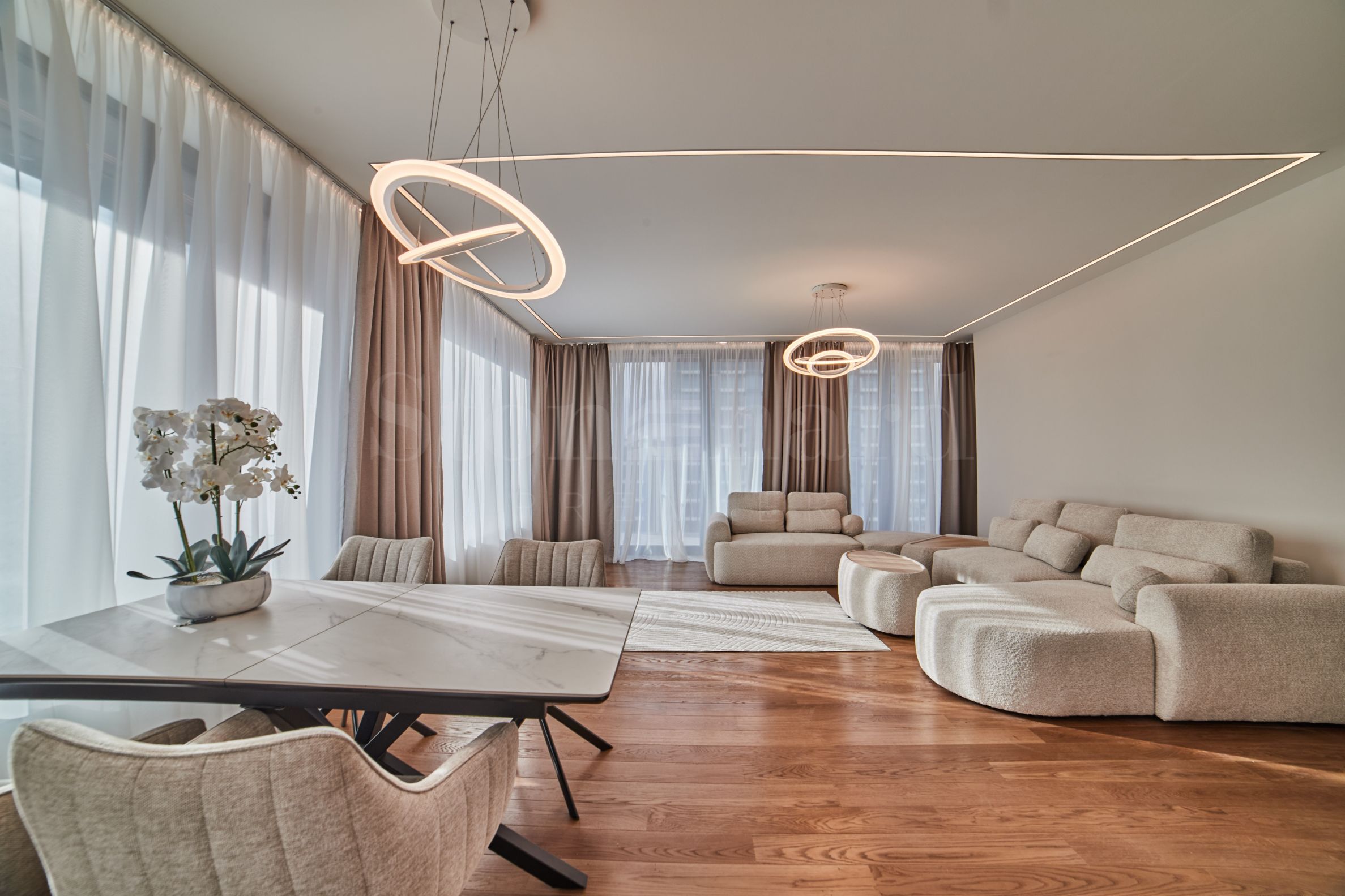 Nemovitost je světlá, nabízí moderní designovou vizi a interiér s čistými liniemi. Velká okna a světlá barevná paleta vytvářejí pocit prostornosti a přispívají k dostatku světla, zatímco kvalitní materiály a elegantní nábytek přispívají k útulnosti a eleganci.