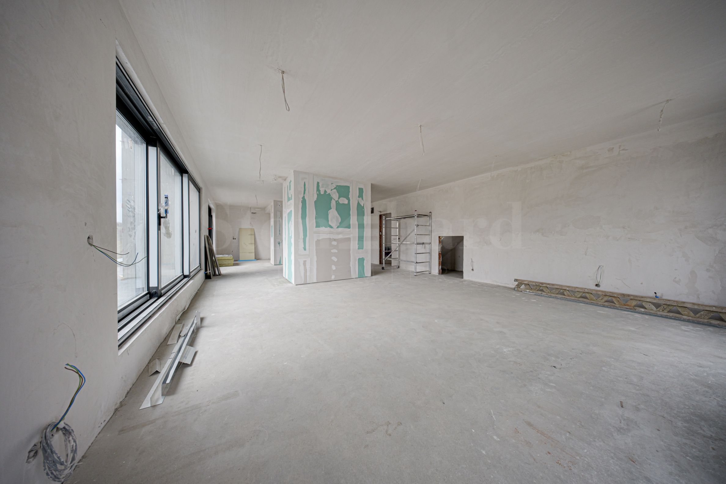 Stěny – sádrové omítky; sociální zařízení – pohledový beton;