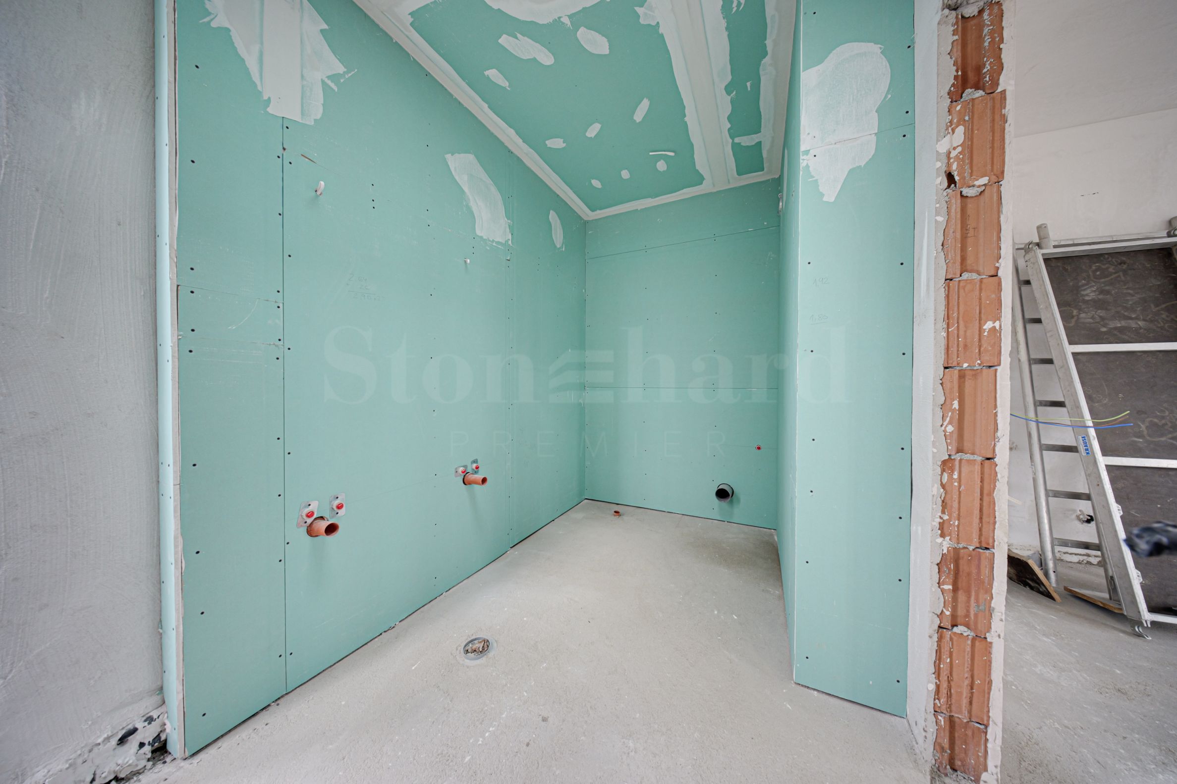 Vnitřní stěny – zdivo o tloušťce 12 cm; v sociálních místnostech dodatečný sádrokarton a vlna;