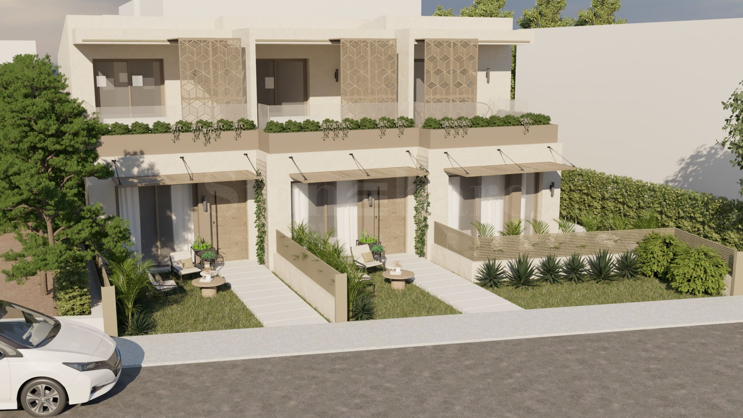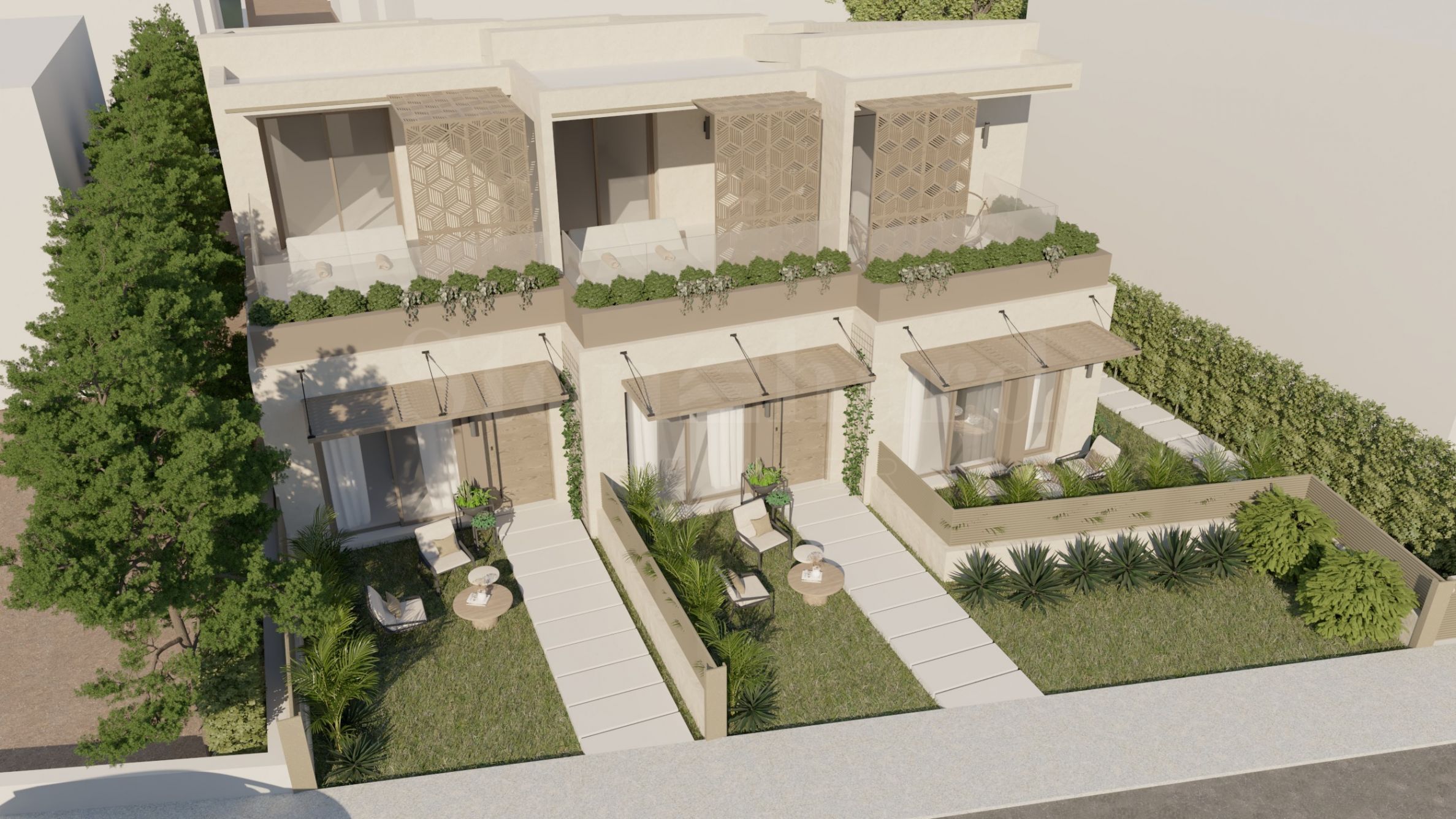 Skládá se ze tří stylových domů, zařazených v řadě, s čistými architektonickými liniemi a pečlivě vybranými detaily fasády. Hliníkové dekorativní prvky dodávají budově moderní vzhled a zdůrazňují moderní vizi. Prostorná zahrada je krásně upravená s koutky pro relaxaci v zeleně - ideální místo pro klidná odpoledne a útulné večery venku.