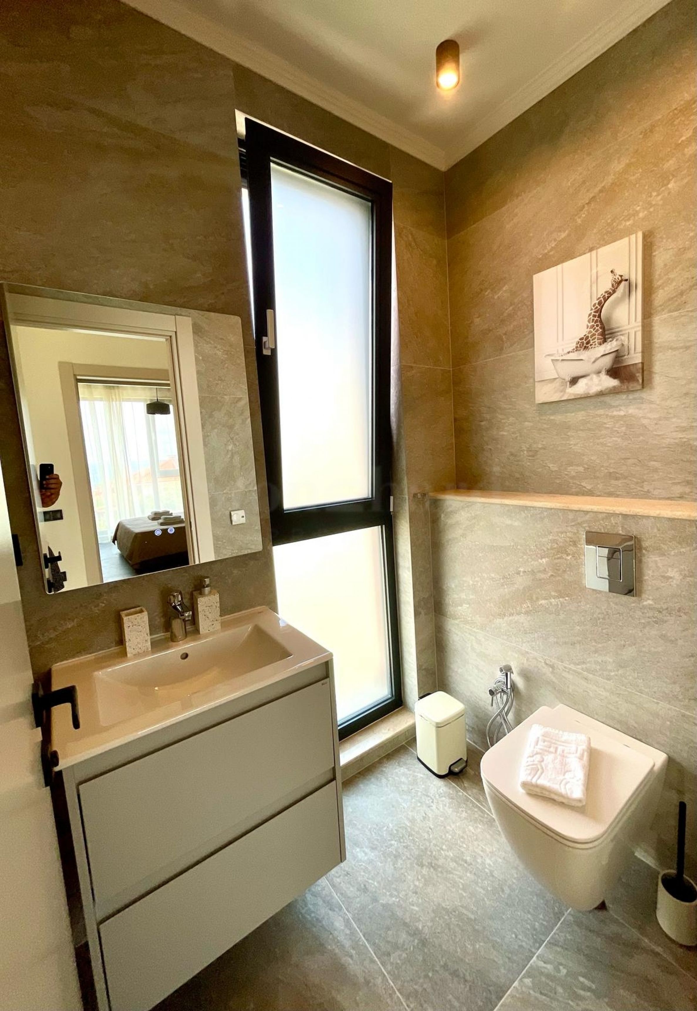 • Podlaha ve všech místnostech a koupelnách je postupně provedena s 5 cm tepelné izolace XPS nad betonovou deskou, armovanou cementovou stěrkou s vlákny, italským granitogres 60/120 cm. Ve všech koupelnách je podlahové vytápění Devi s termoregulačním prvkem;