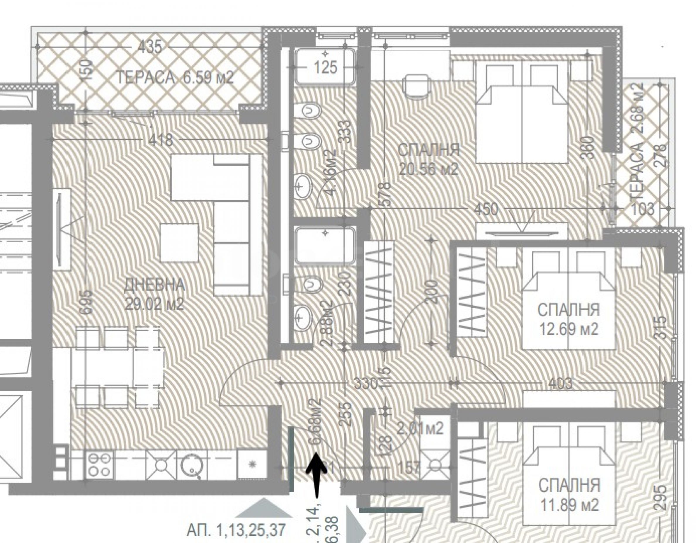 Byt se nachází ve 4. patře a skládá se ze 2 ložnic, obývacího pokoje, 2 teras, 2 koupelen/toalet, vstupní haly a technické místnosti. Nemovitost má celkovou plochu 135,73 m2, z toho zastavěná plocha 103,74 m2 a další sklad o rozloze 3,40 m2. Orientace je východ, jihovýchod a jih.