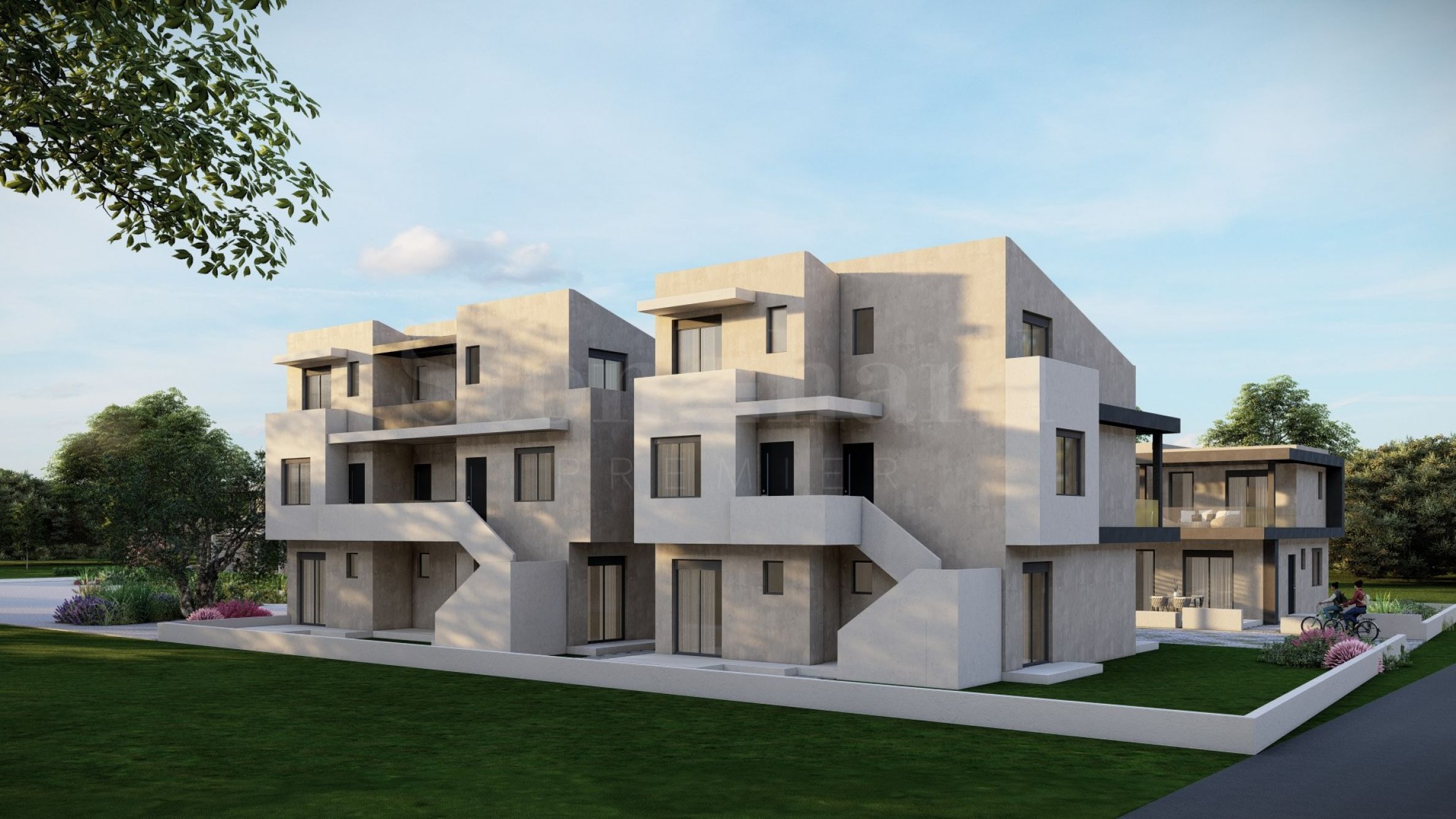 5 apartmánů v přízemí od 33,82 m² do 34,18 m², sestávající z obývacího pokoje s kuchyňským koutem, 1 ložnice, 1 koupelny;