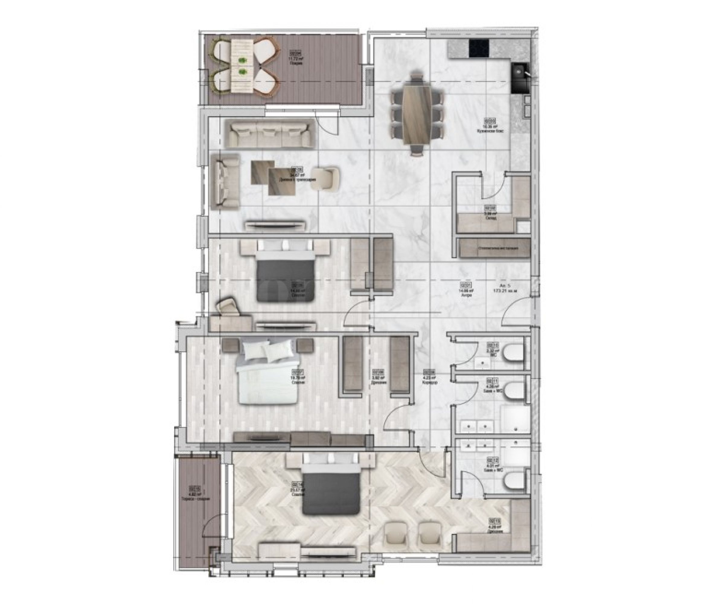 Čtyřpokojový byt, který vám představujeme k prodeji, se nachází ve 2. patře a má celkovou rozlohu 207,43 m2. Byt je nabízen s vysoce kvalitním provedením dle BDS. Fotografie v nabídce jsou ilustrativní - společné pro celý komplex.