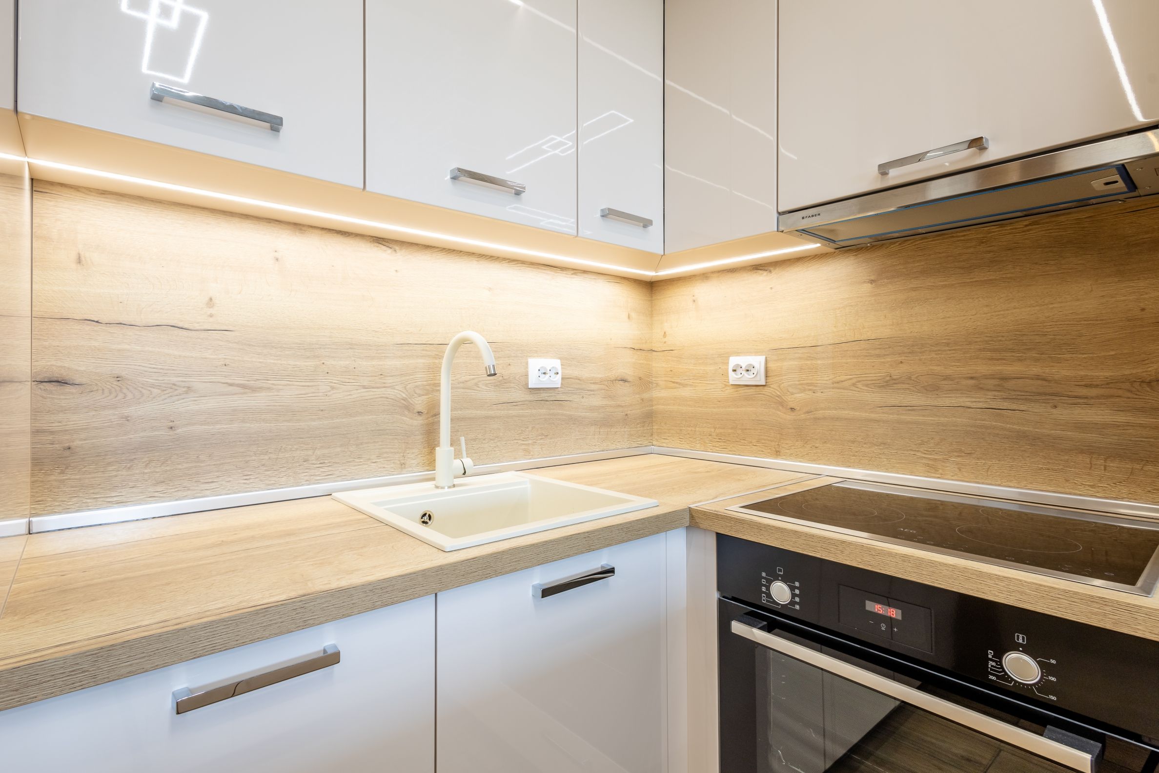 prostorný, stylový obývací pokoj s výborně vybavenou kuchyní;