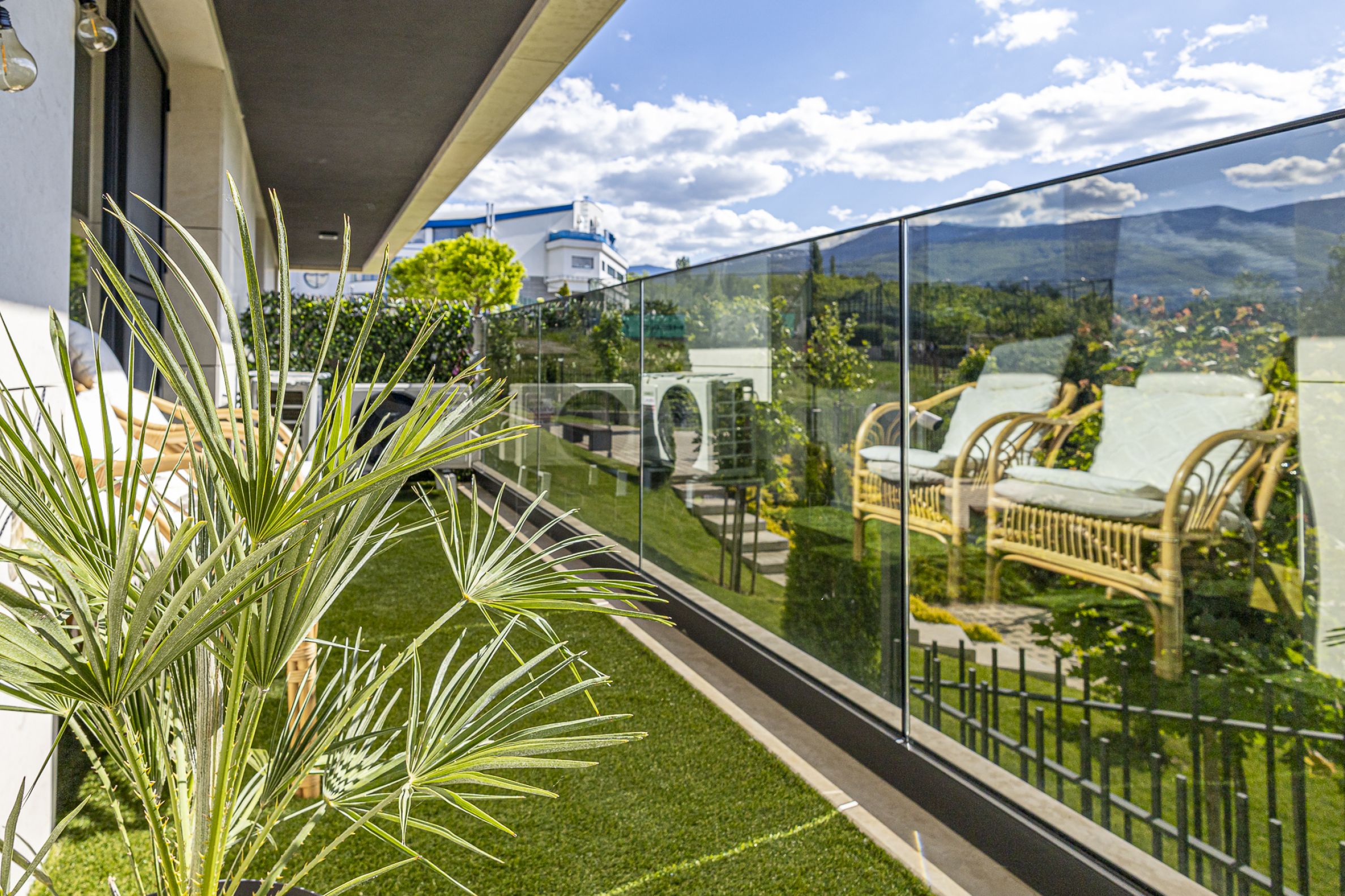 rozsáhlou terasu s panoramatickým výhledem na hory, vynikající zónu pro relaxaci venku, s výhledem i na udržovanou zelenou zahradu. Vytápění je centrální a klimatizace. Na oknech jsou také instalovány sítě proti hmyzu.