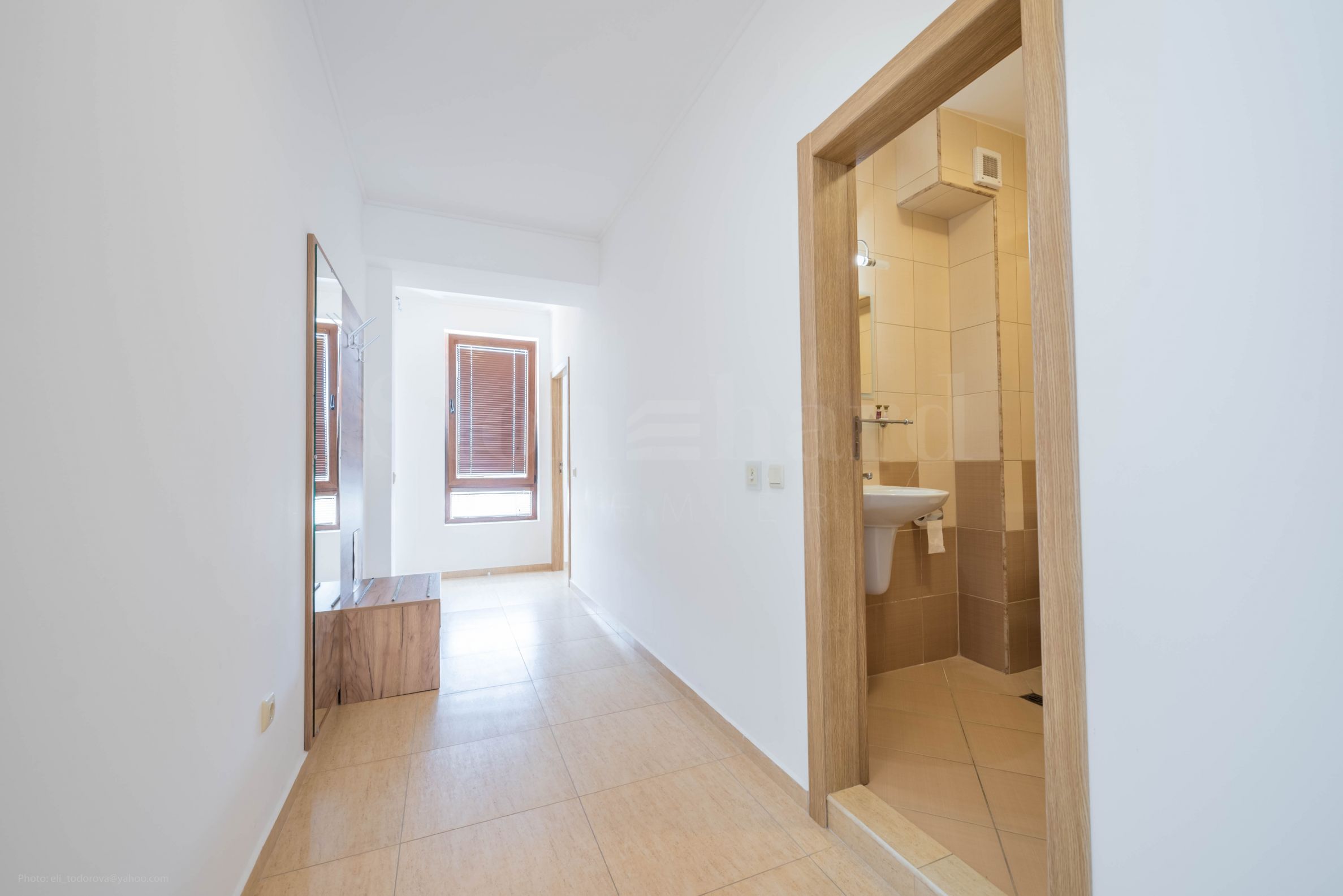 prostorná chodba s předsíňovou stěnou a zrcadlem v plné výšce;