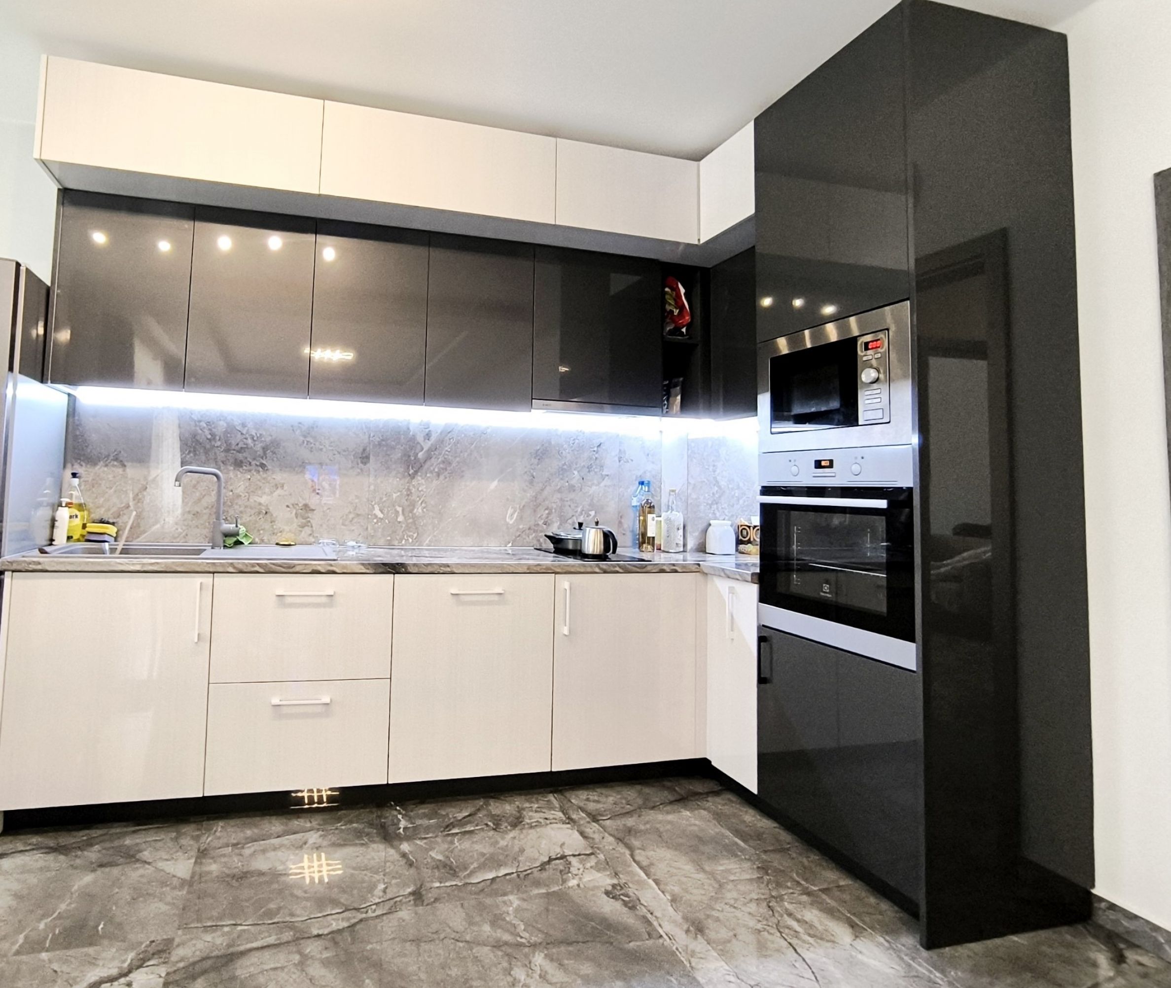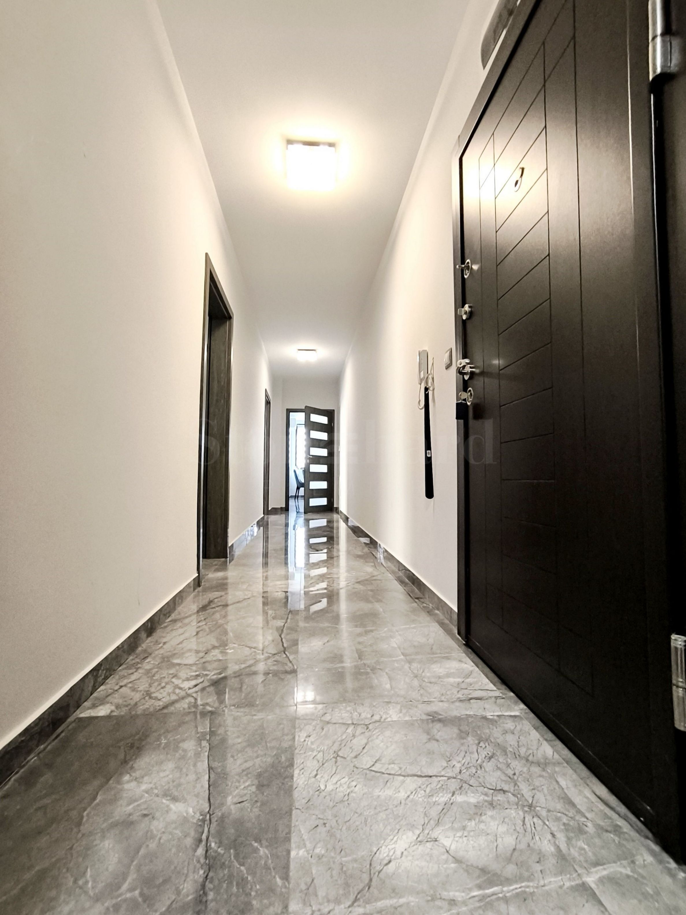 Nemovitost o celkové ploše 100 m² se nachází v 1. patře a je nabízena s nábytkem a technikou, připravena k nastěhování. Interiér je řešen v šedé a bílé barvě, s důrazem na detail a pohodlí budoucích obyvatel.