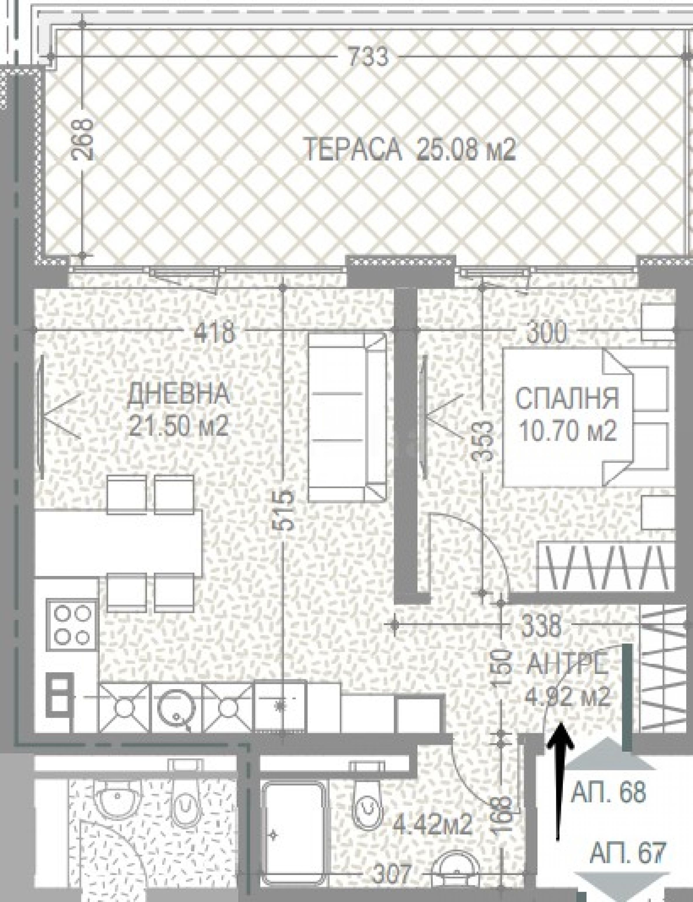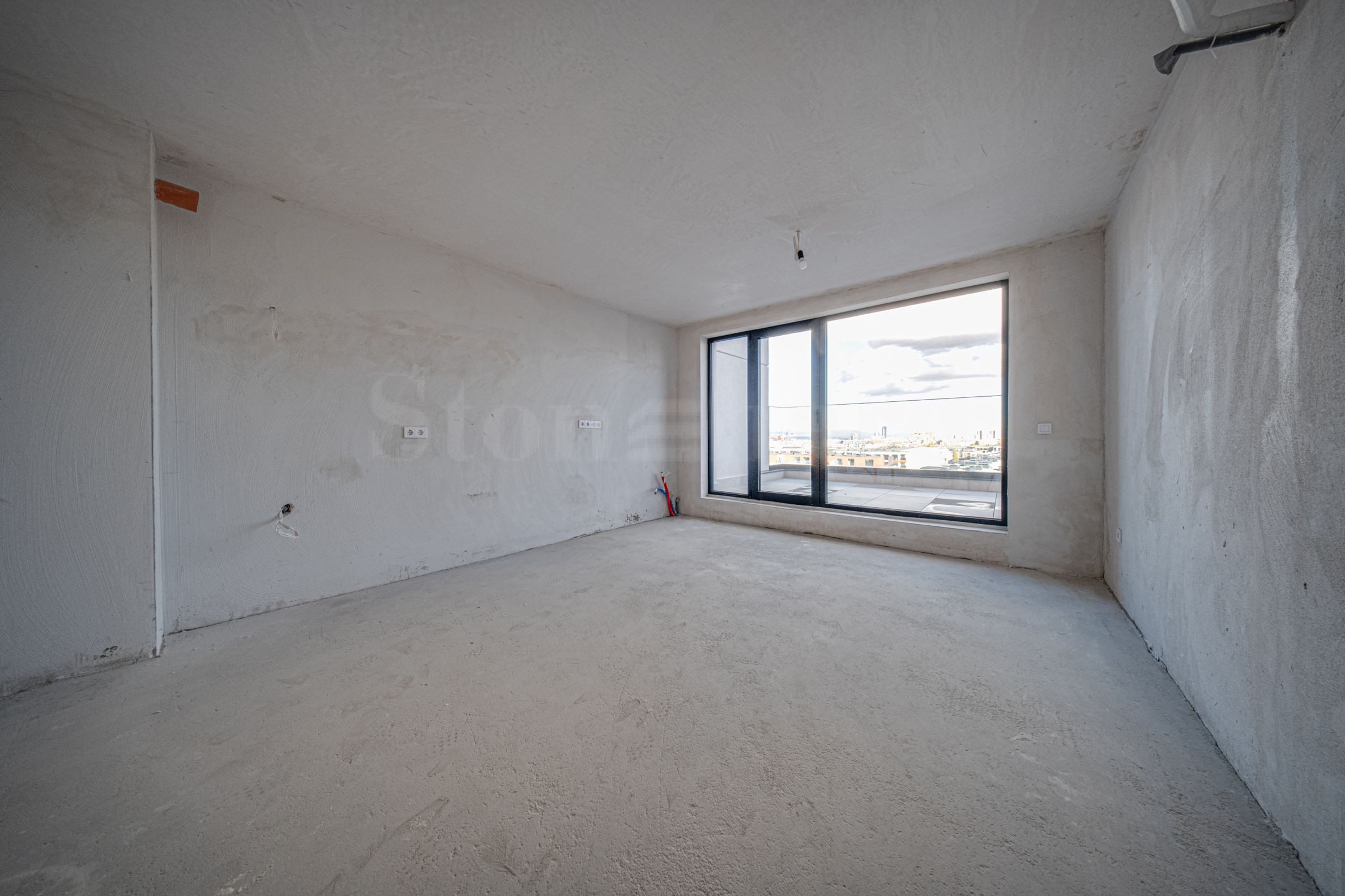 Byt se nachází v 6. patře a skládá se z předsíně, koupelny s toaletou, obývacího pokoje s kuchyní a jídelnou, ložnice, velké terasy s výstupem z obou pokojů, s výhledem na město, částečně na Vitošu, Loženskou a Starou horu. Nemovitost má celkovou plochu 99,76 m², se skladem o ploše 3,31 m².
