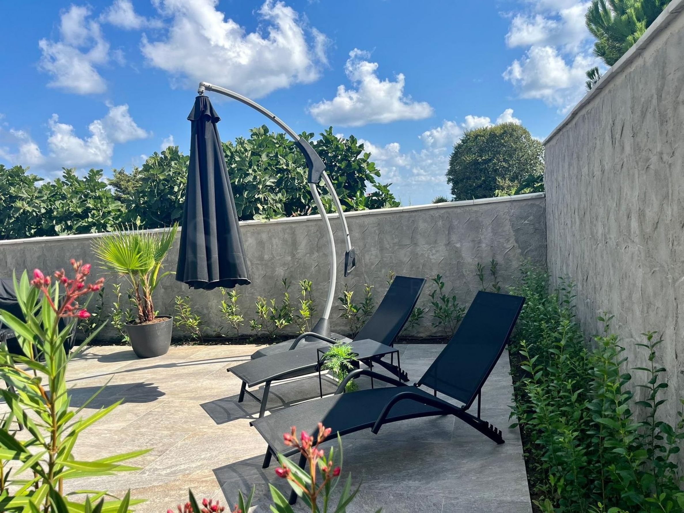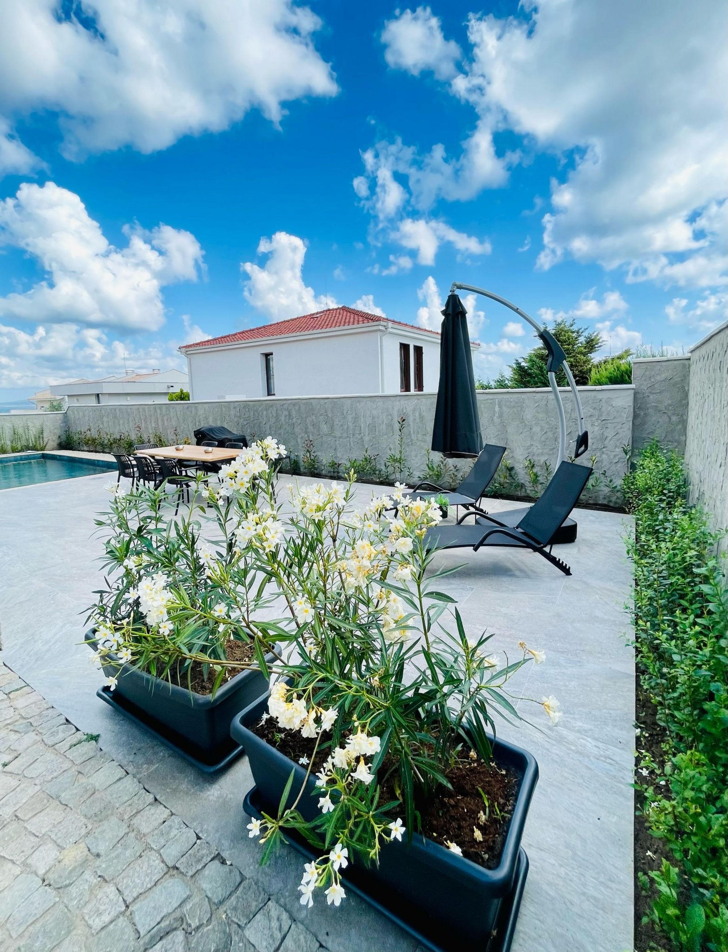 • Plot z betonové části na třech stranách pozemku, vpředu betonová a průhledná část z kompozitního dřeva bez potřeby údržby;