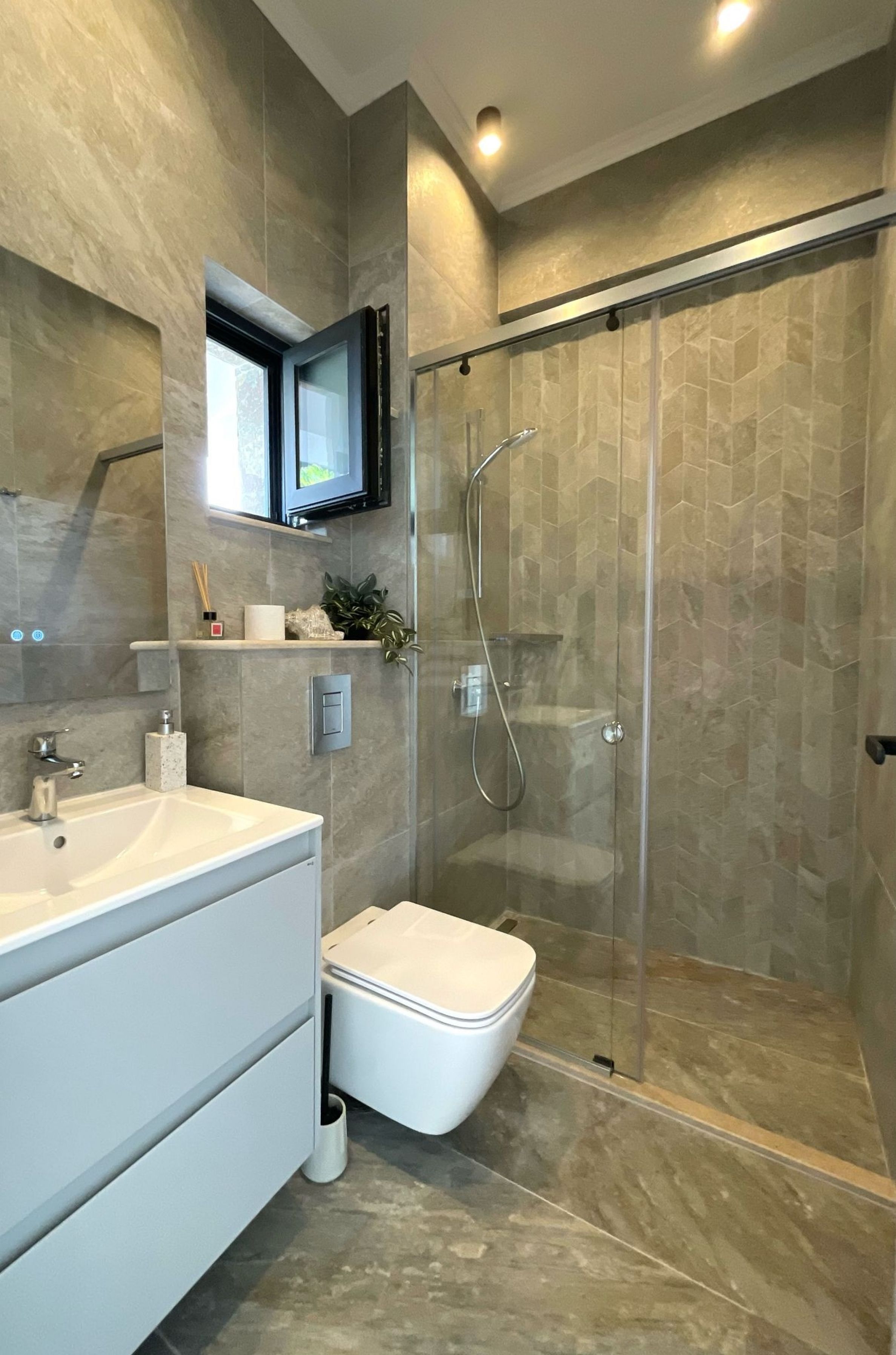 • Podlaha ve všech místnostech a koupelnách je postupně provedena s 5 cm tepelné izolace XPS nad betonovou deskou, armovanou cementovou stěrkou s vlákny, italským granitogres 60/120 cm. Ve všech koupelnách je podlahové vytápění Devi s termoregulačním prvkem;