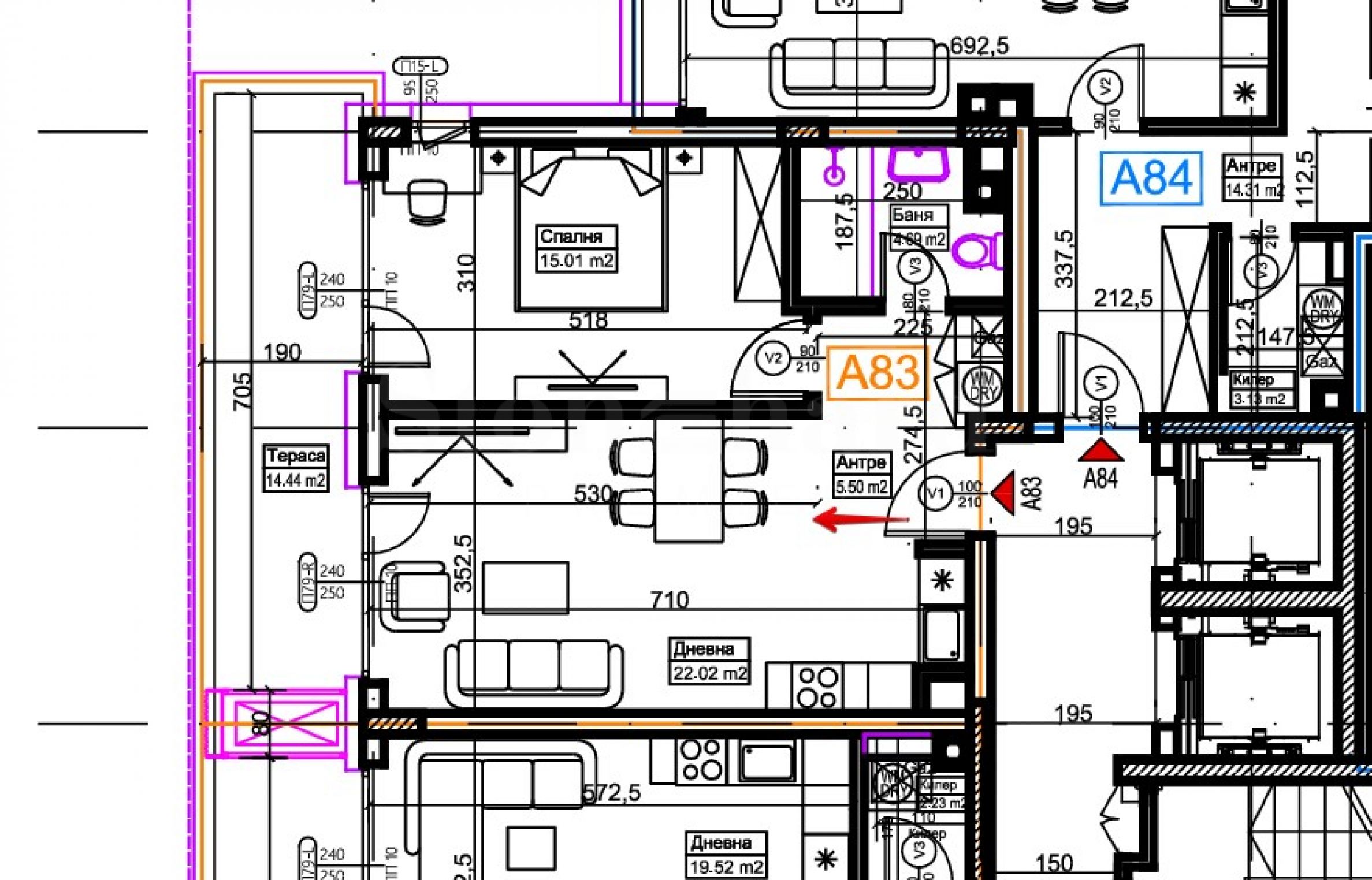 Komfortní nemovitost se nachází v 8. patře z 9, její orientace je západní, s panoramatickým výhledem na horu Vitoša. Na čisté ploše 67,76 m² se nachází: vstupní hala, koupelna s toaletou, obývací pokoj s kuchyní a jídelnou, jedna ložnice, prostorná terasa s přístupem z obou pokojů. Byt se prodává ve stavu dokončení dle BDS.