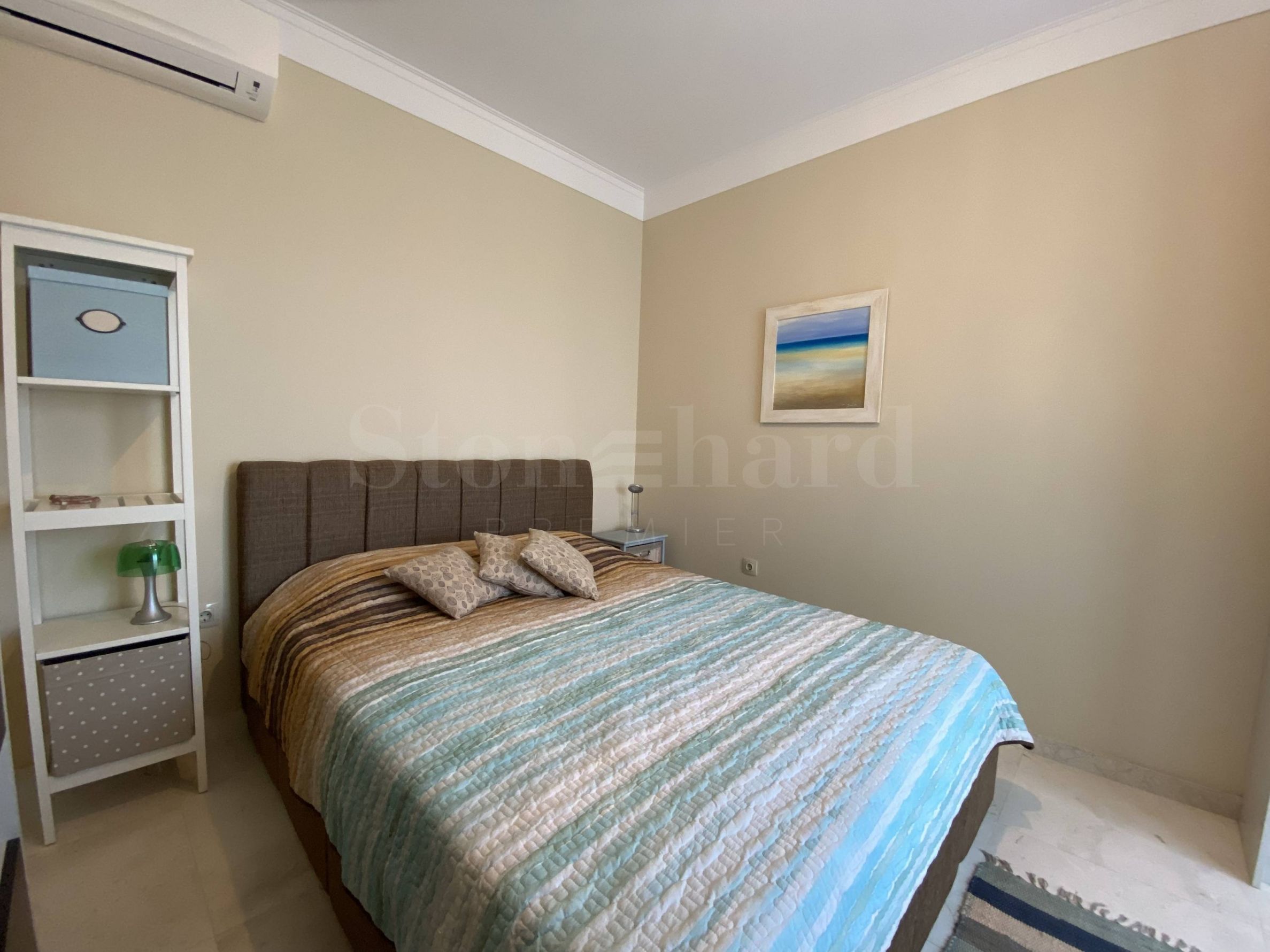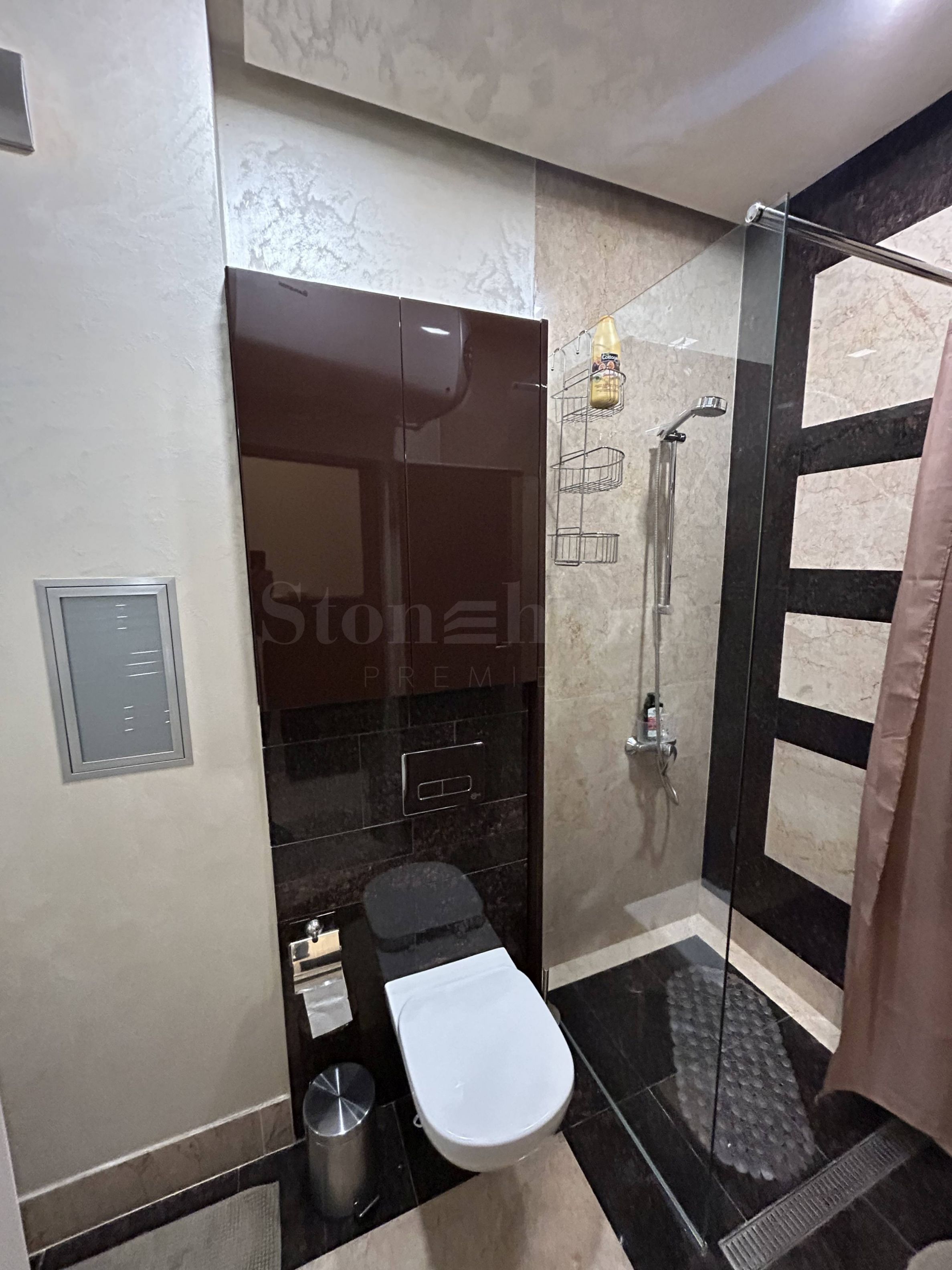• Ložnice má luxusní matraci a mechanismus pro zvedání a ukládání zavazadel. Podlahy ve všech místnostech bytu jsou z přírodního kamene, stejně jako koupelna je obložena na podlaze a stěnách z přírodního kamene a mramoru, vybavena sprchovým koutem a velkým elektrickým bojlerem (horizontálním).