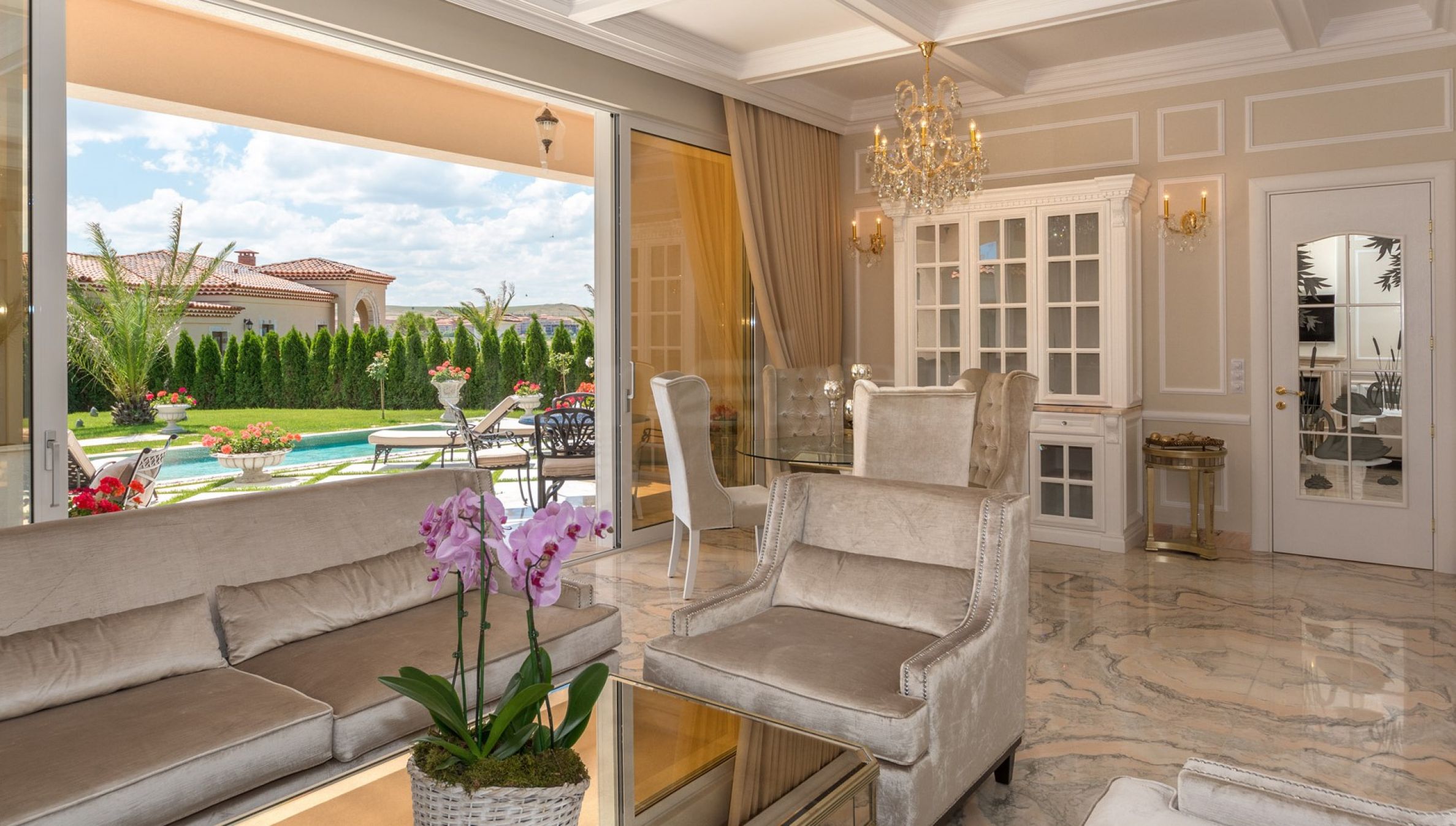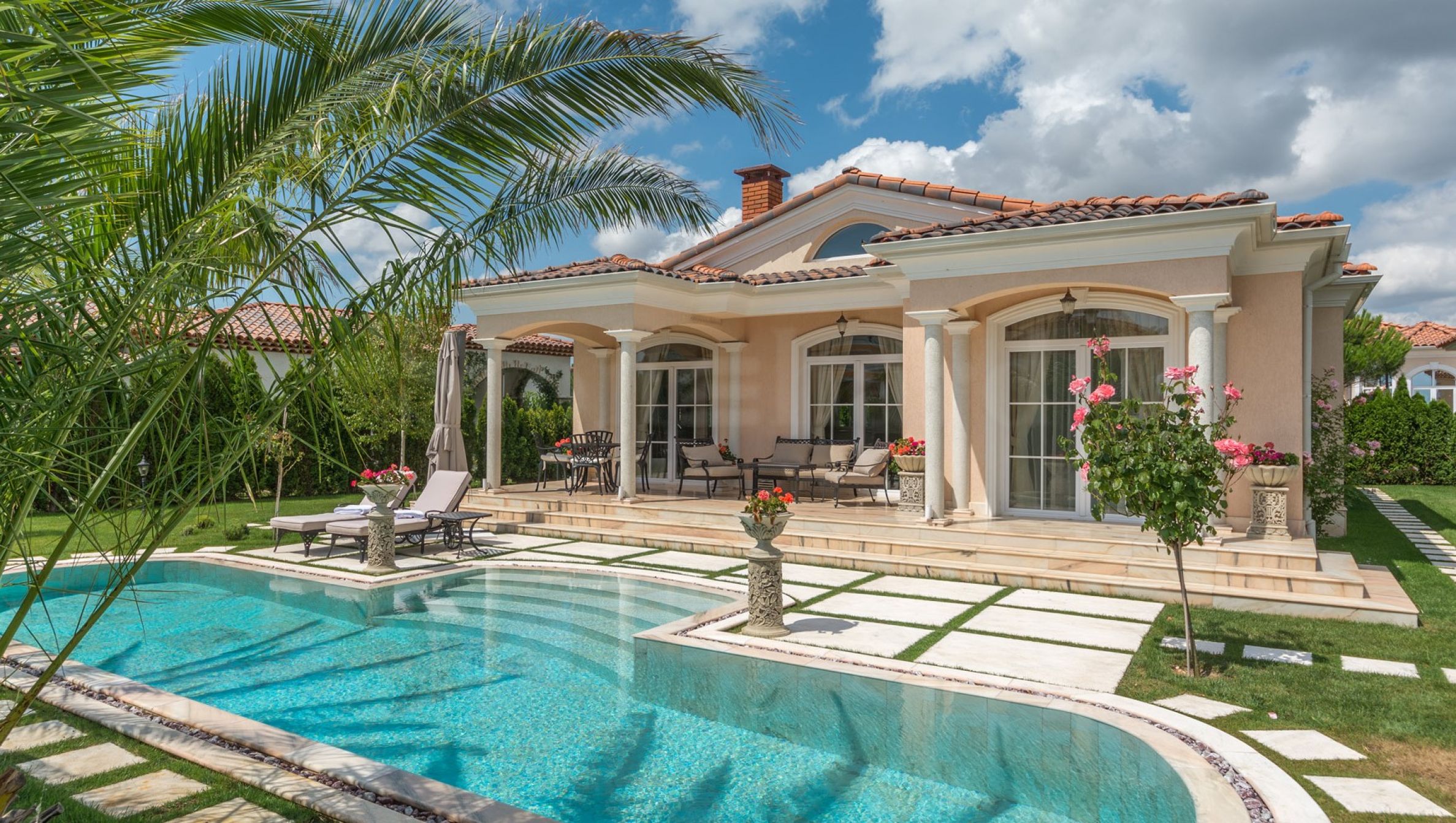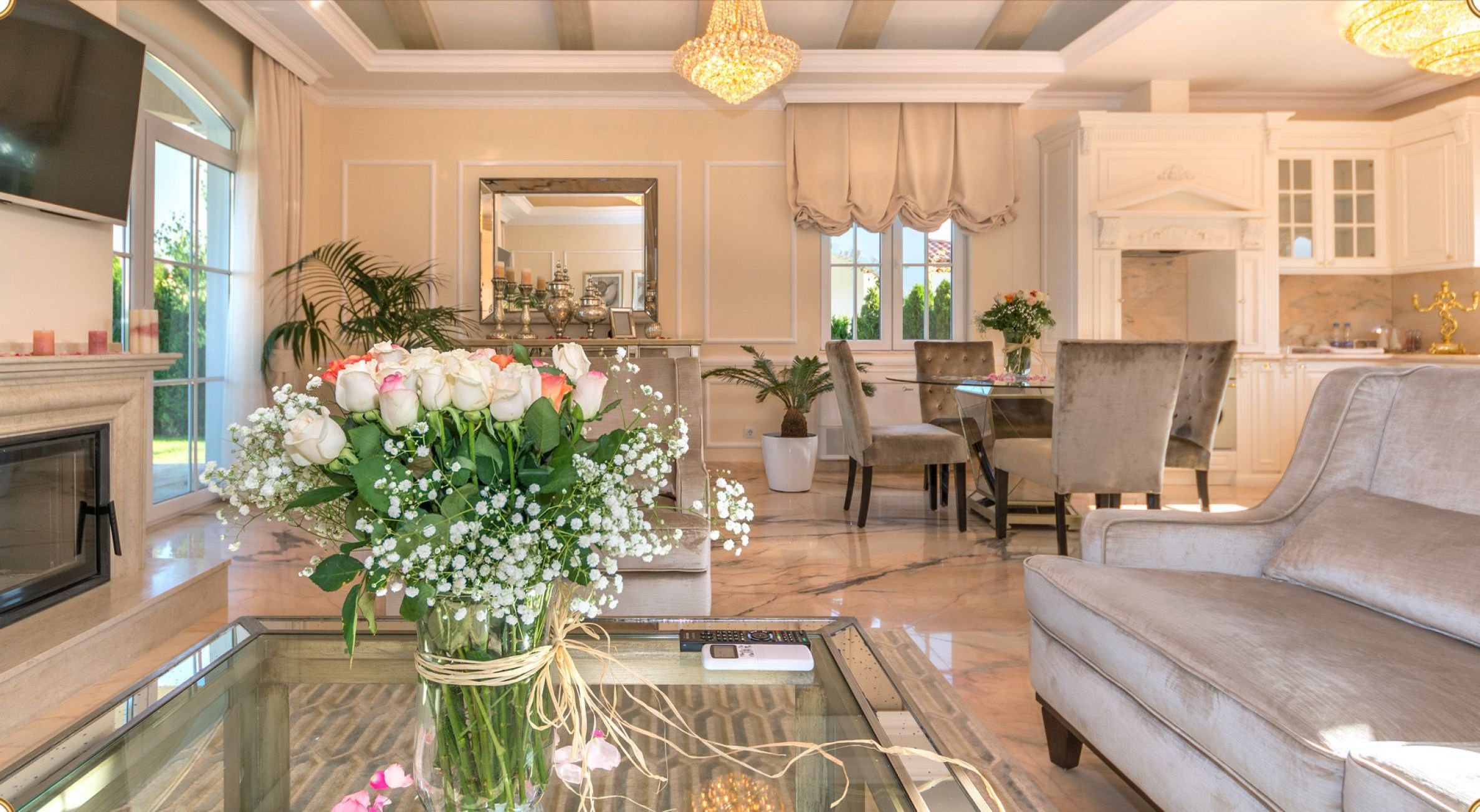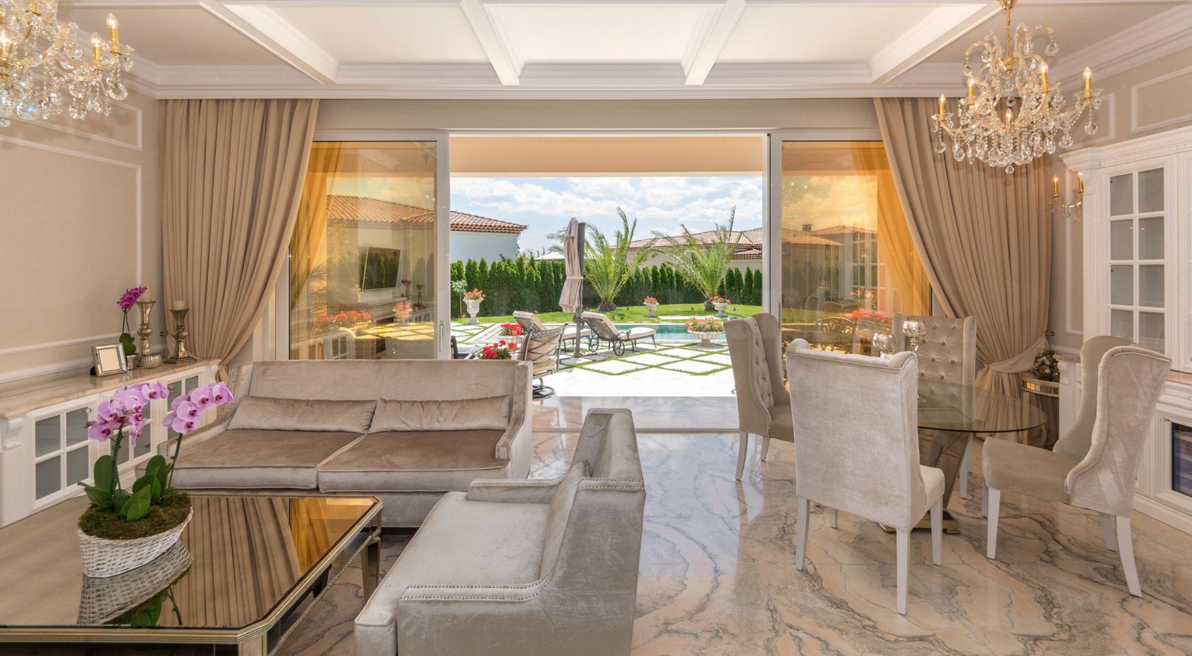 Dům je luxusně zařízený, zdobený originálními vitrážovými okny s kompletně individuálně vyrobeným nábytkem. Interiér využívá mimořádně kvalitní přírodní materiály, přírodní mramor „Pyrgos Light“. Nemovitost s reprezentativním vchodem nabízí tři dvoulůžkové ložnice s vlastní koupelnou a šatnou, obývací pokoj „otevřený prostor“ s kuchyní a jídelnou, verandu a krb. Bazén se nachází v centru města a je obložen výhradně přírodním mramorem „Pyrgos Light“. Zahrada je prostorná a bohatě upravená exotickými stromy a květinami.