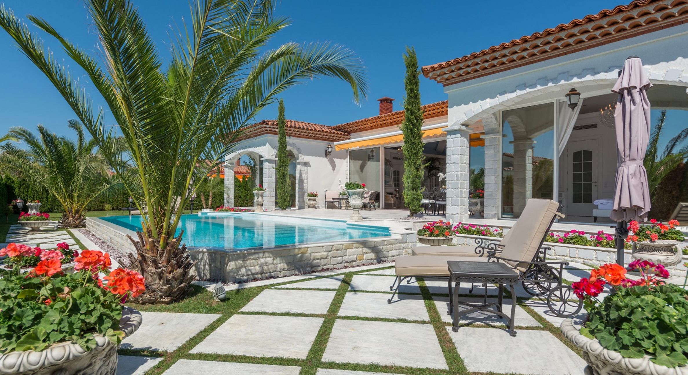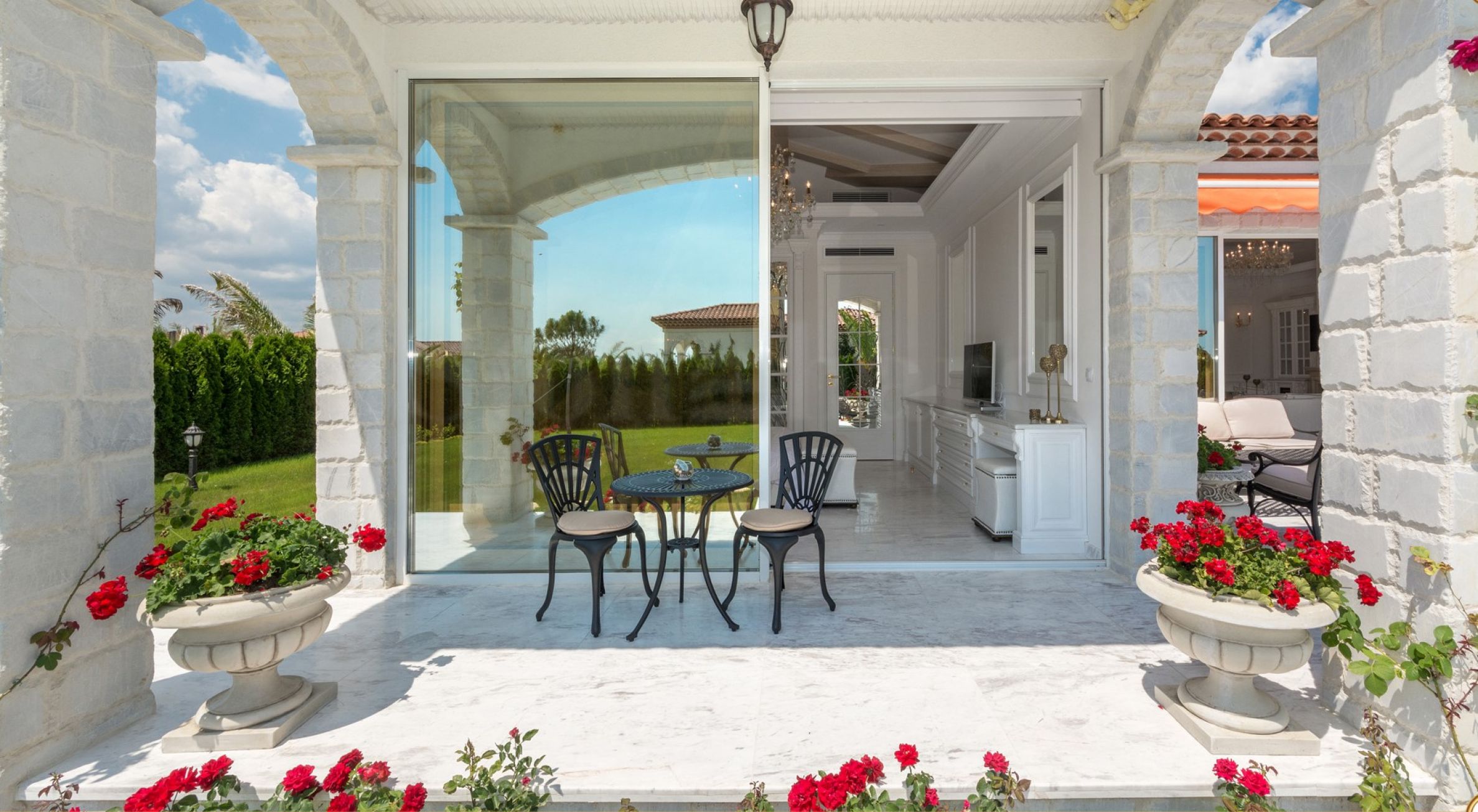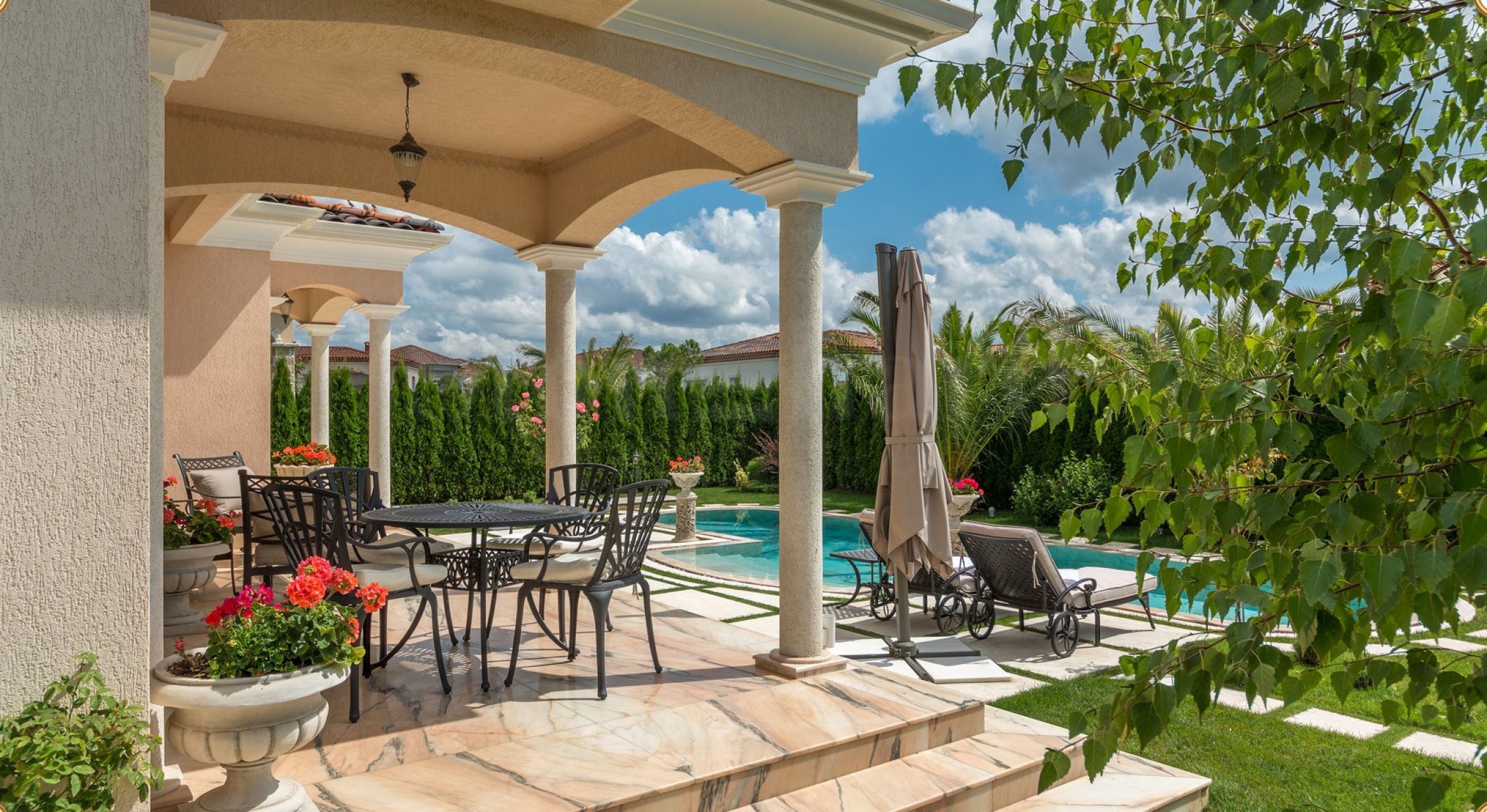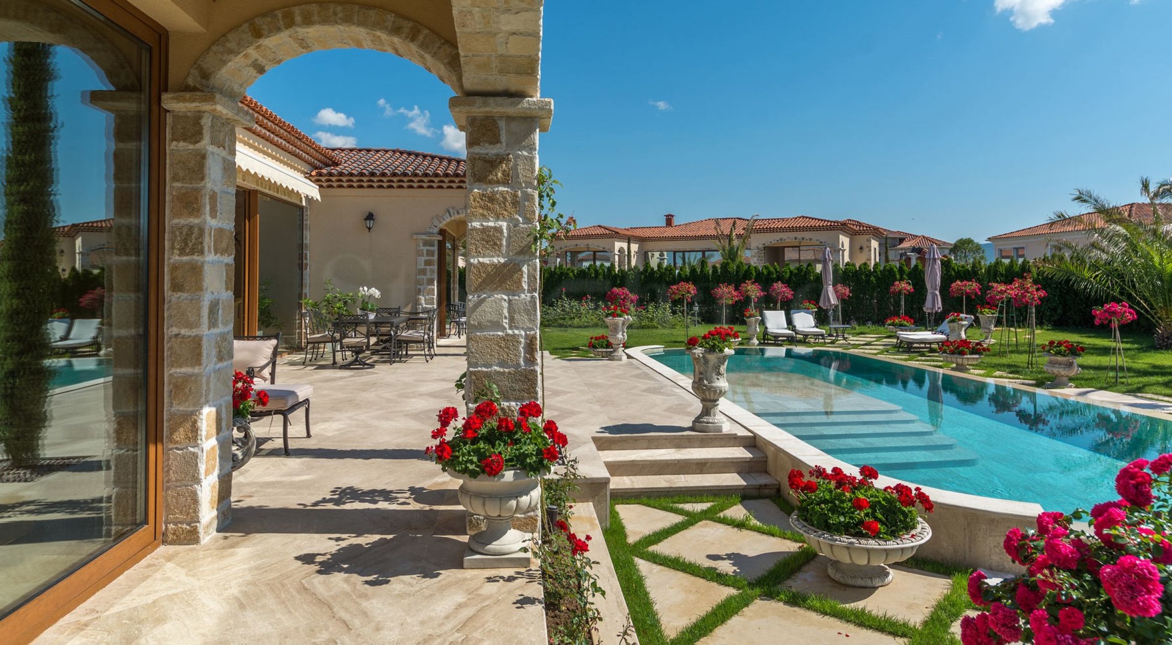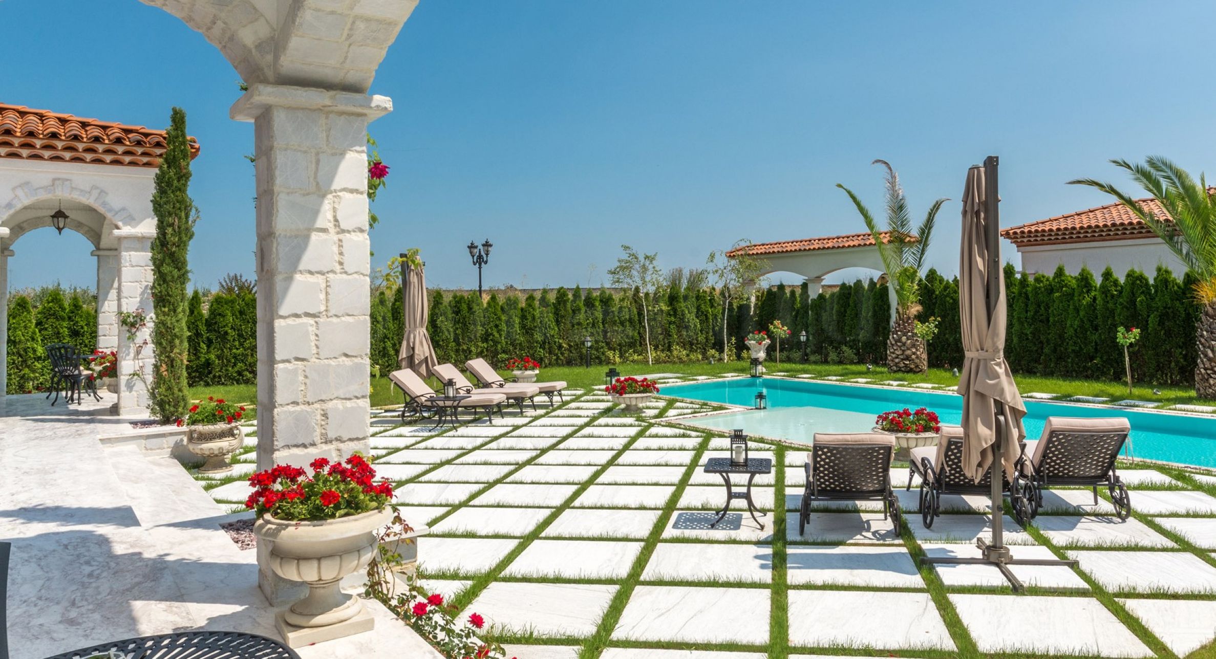 Veranda vede přímo k velkému bazénu, který se nachází uprostřed zahrady a je kompletně obložen přírodním mramorem „Pyrgos Light“.
